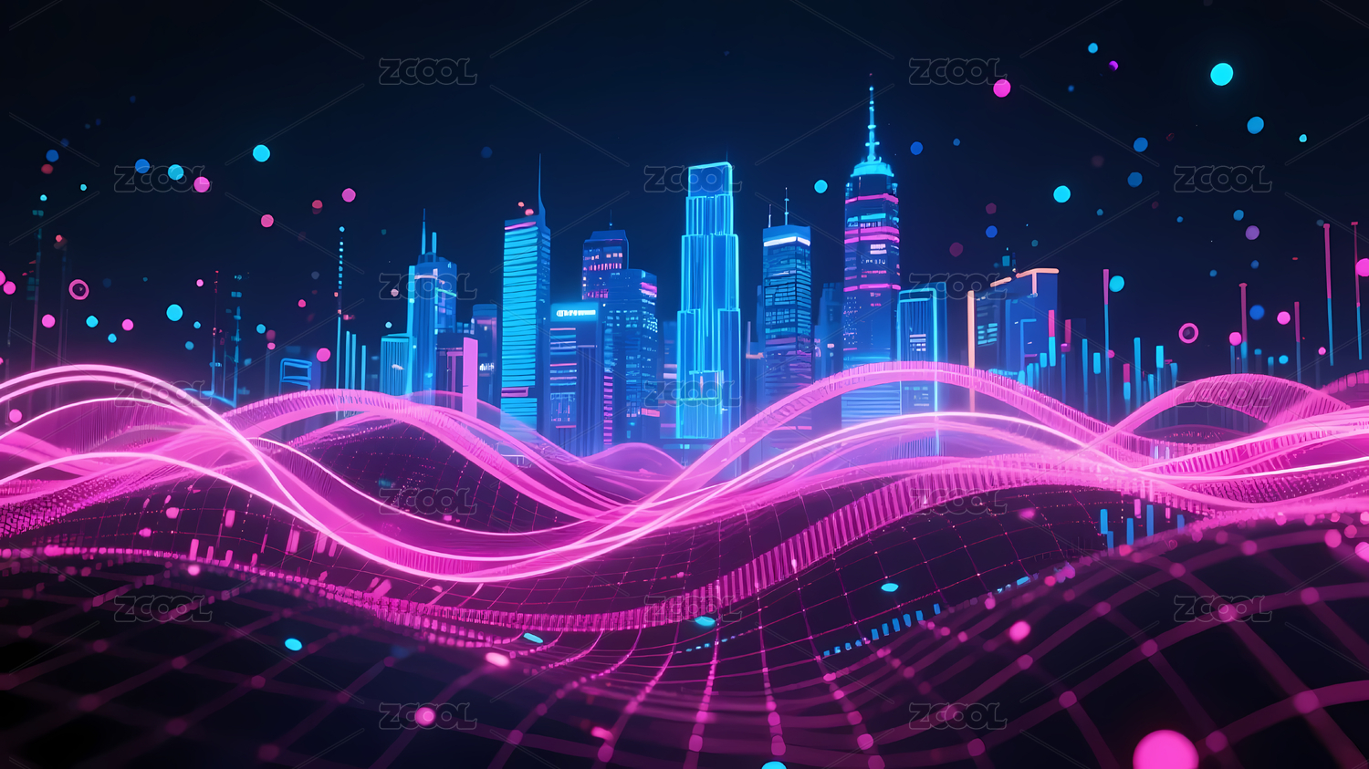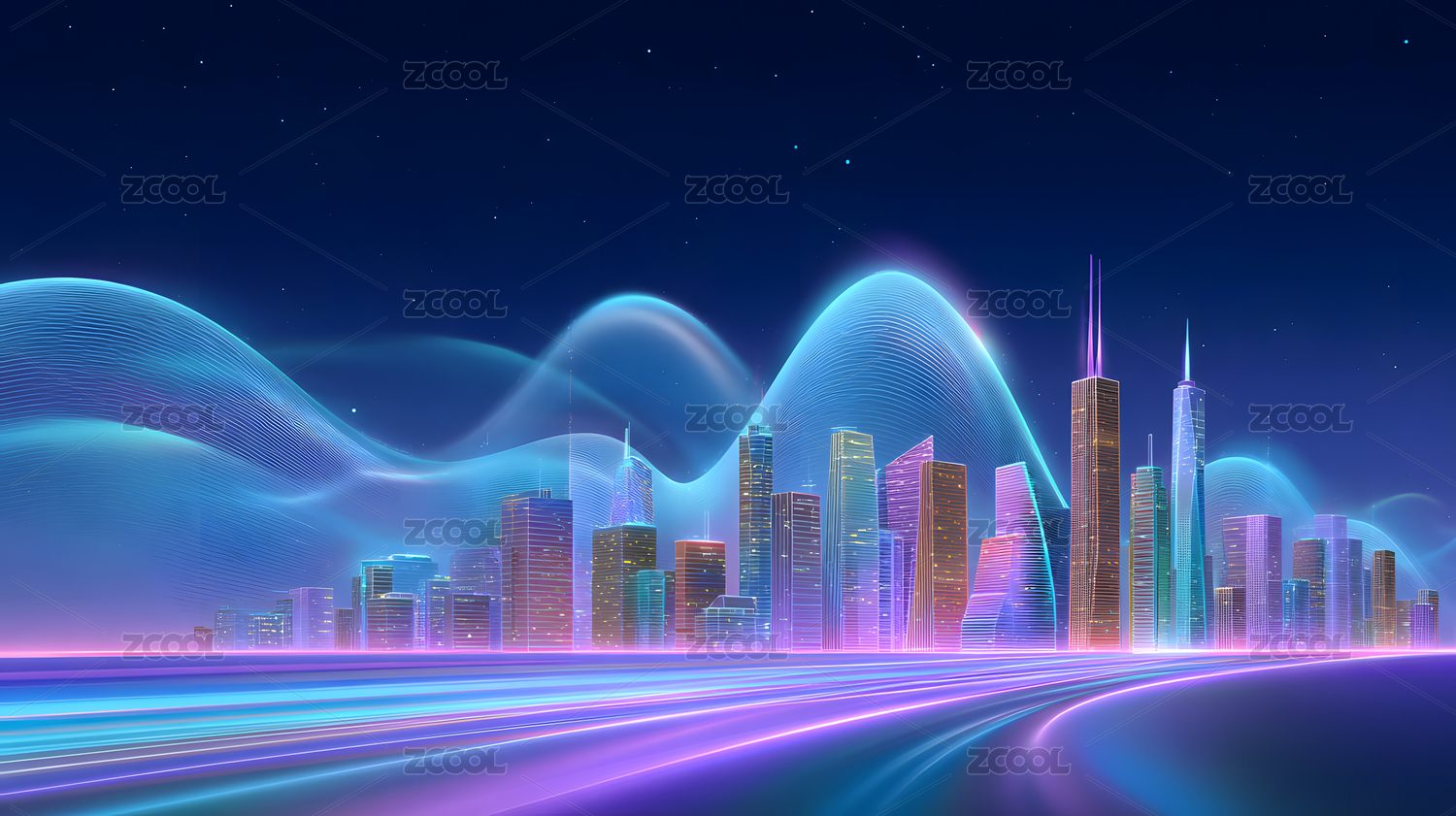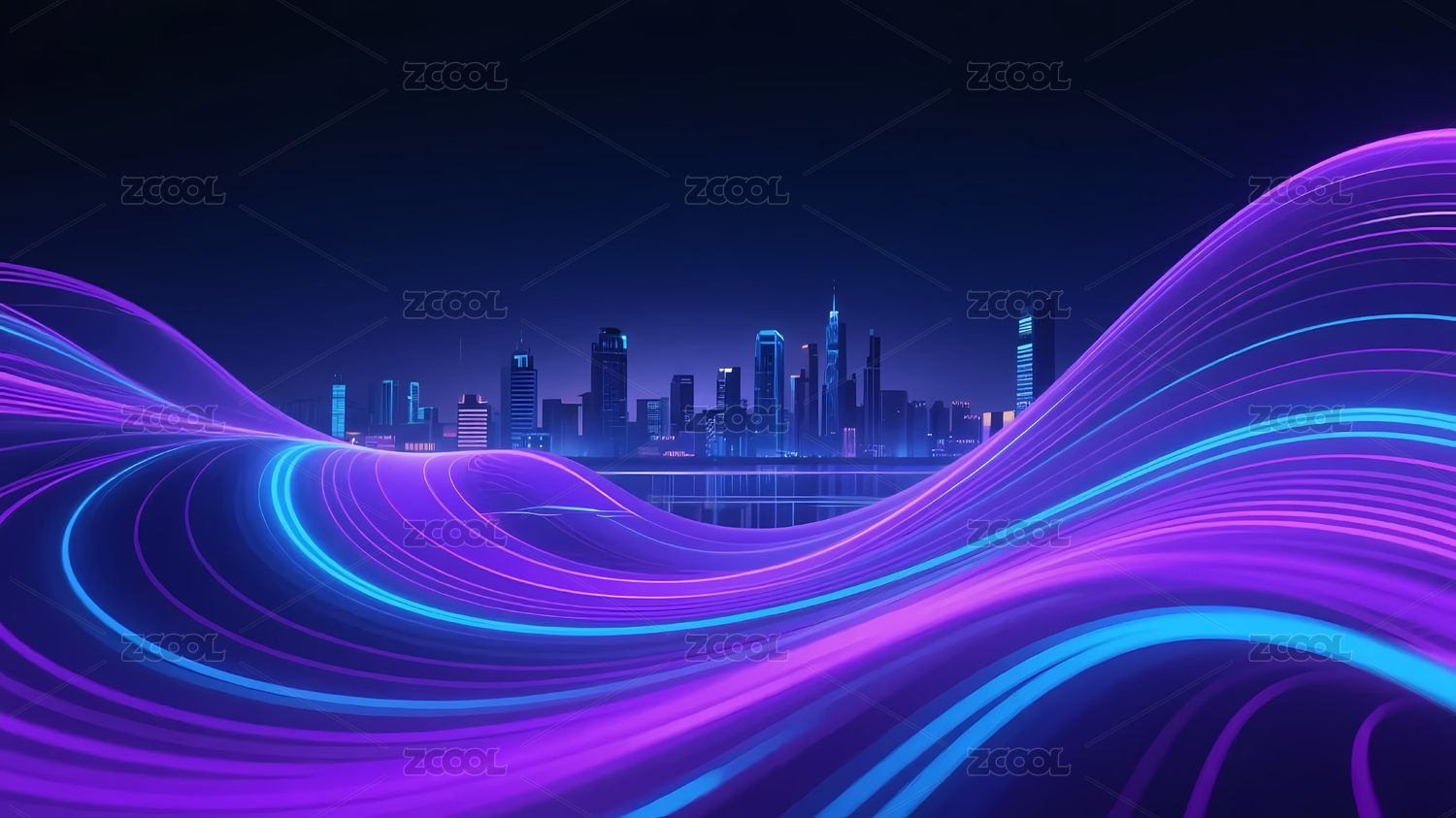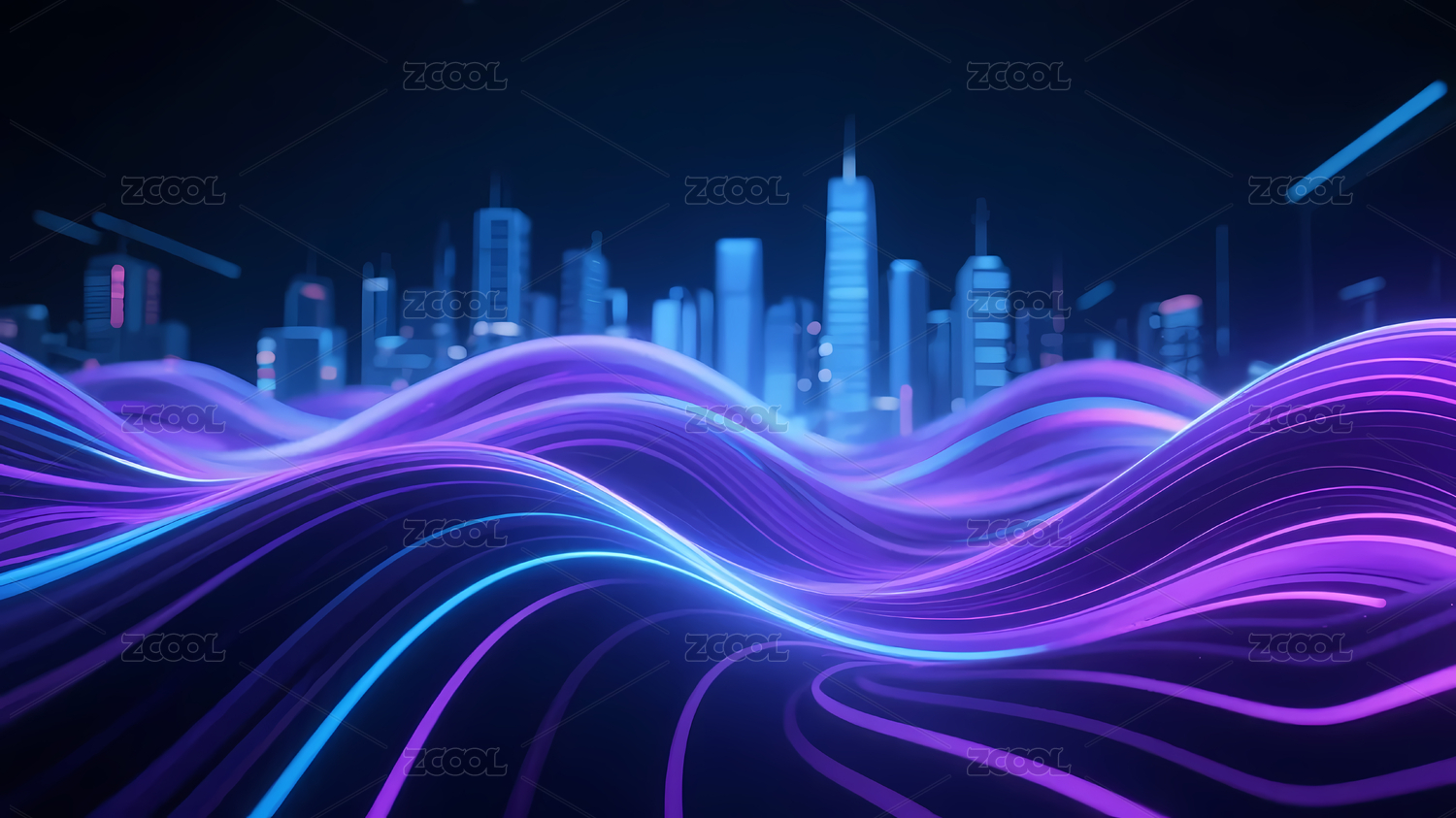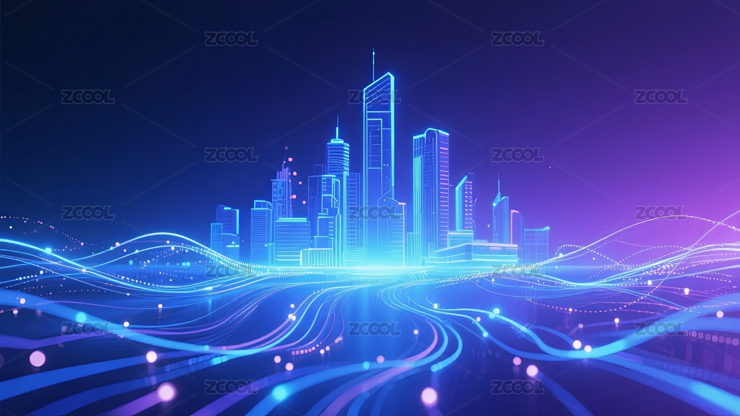 抽象数据流线条发光未来城市轮廓蓝紫色渐变