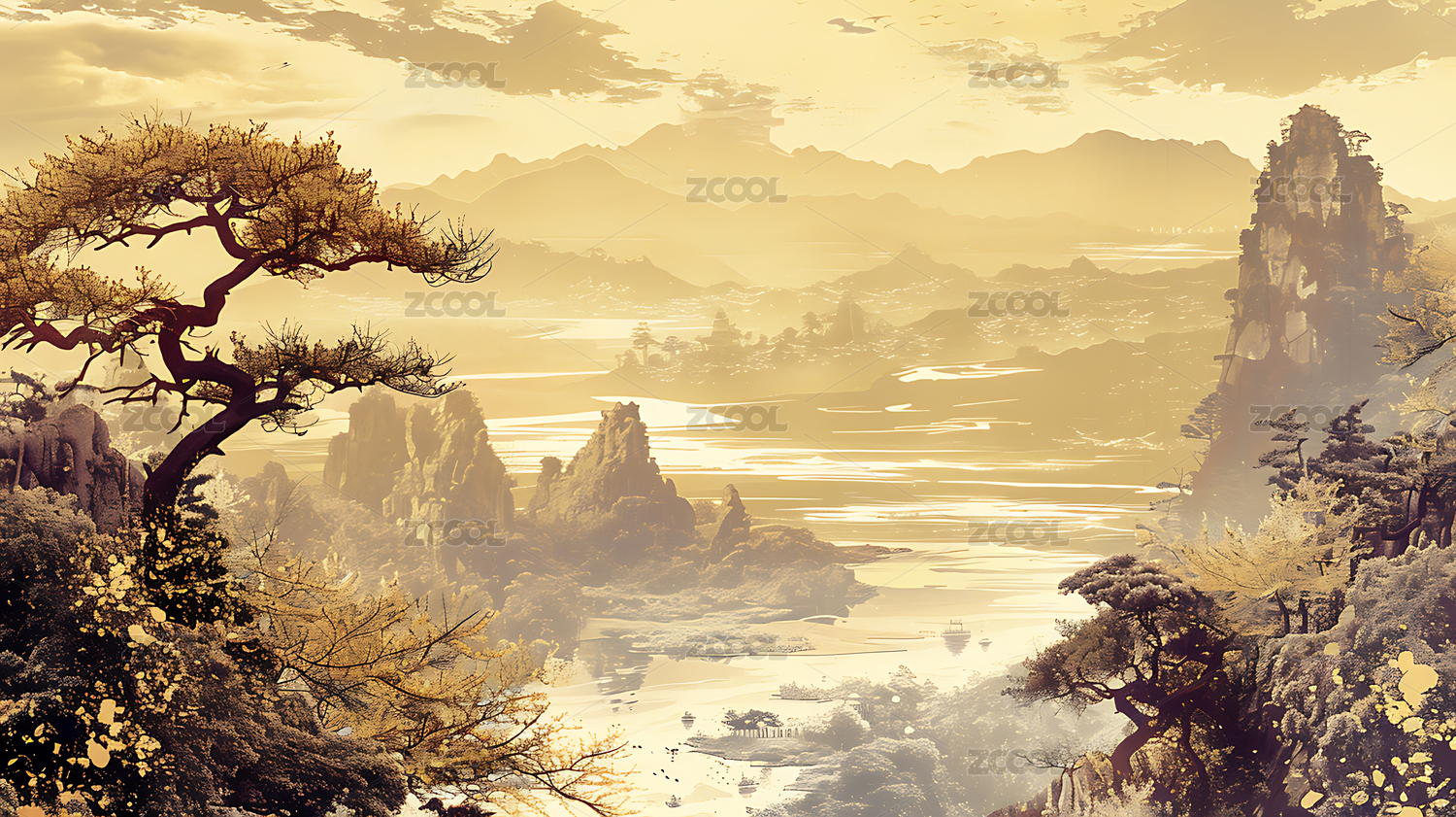 宁静的湖泊与雾气缭绕的山峰和中国传统建筑
