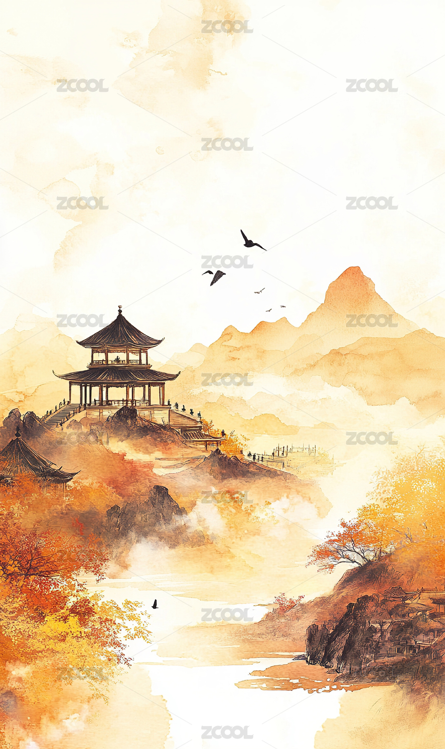 中国风山水建筑自然秋天落叶枫叶插画壁纸