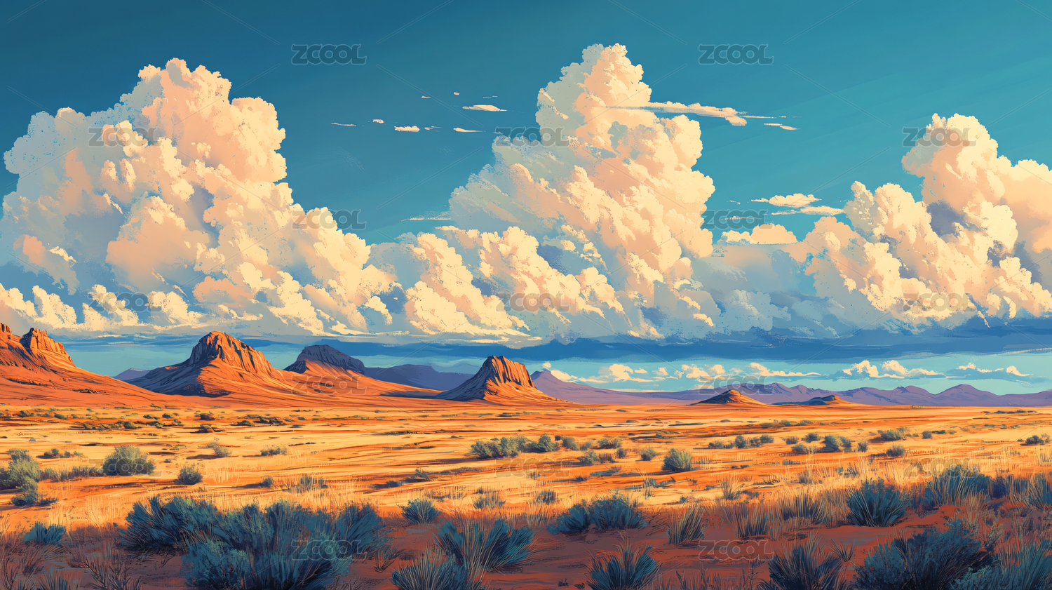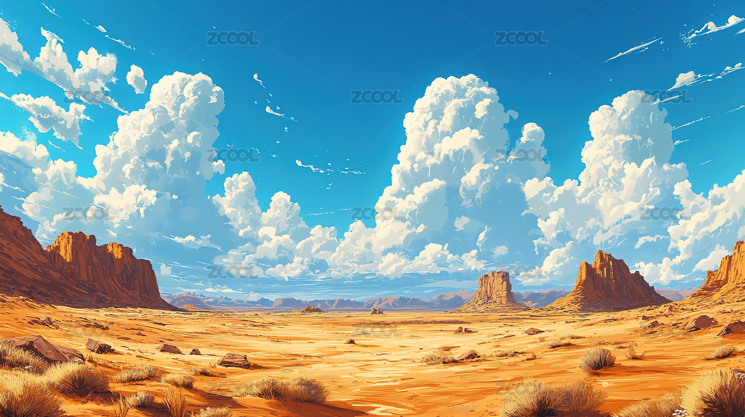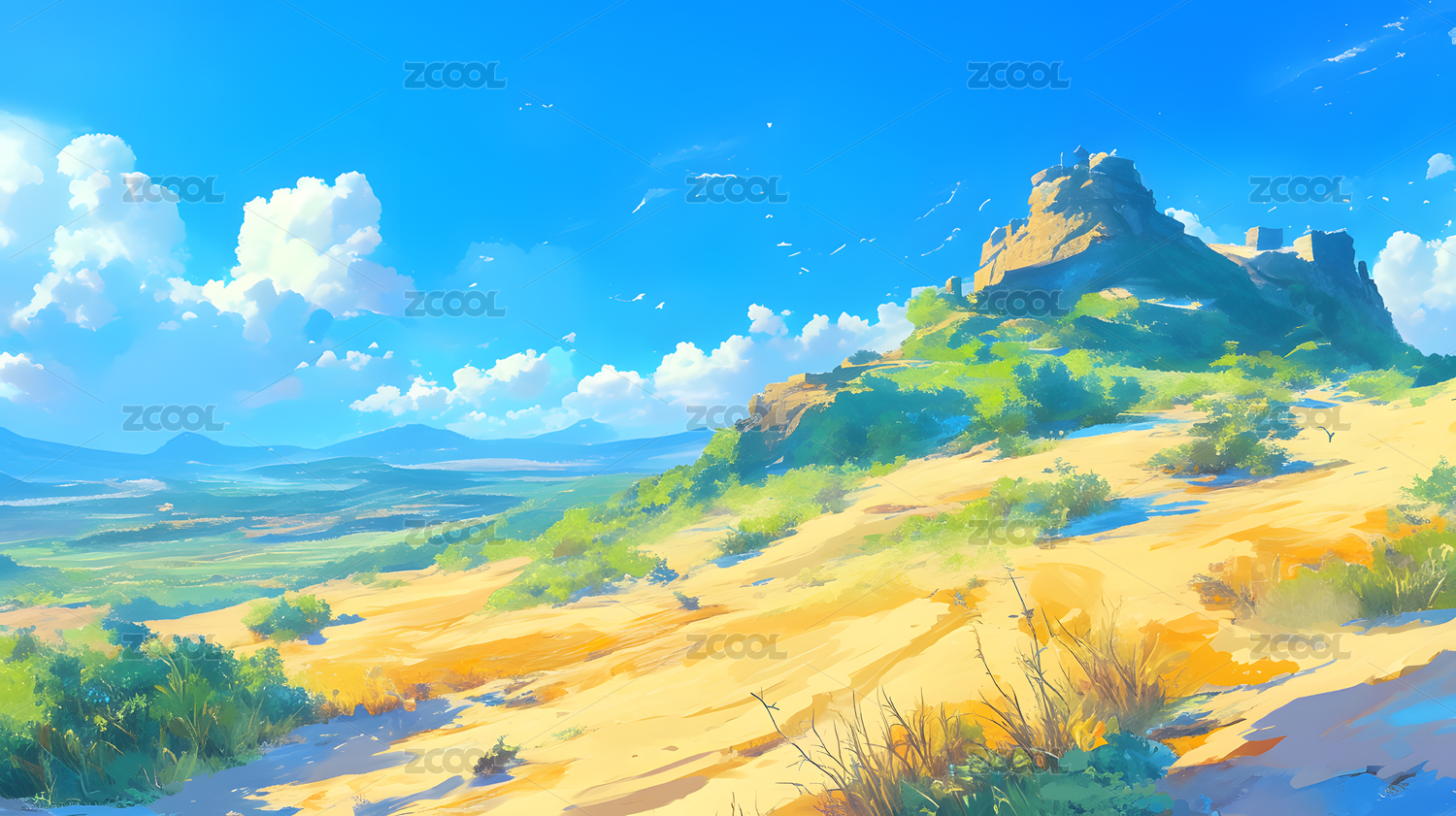 插画,卡通,自然,风景,天空,蓝天,云朵,户外,沙漠,沙丘