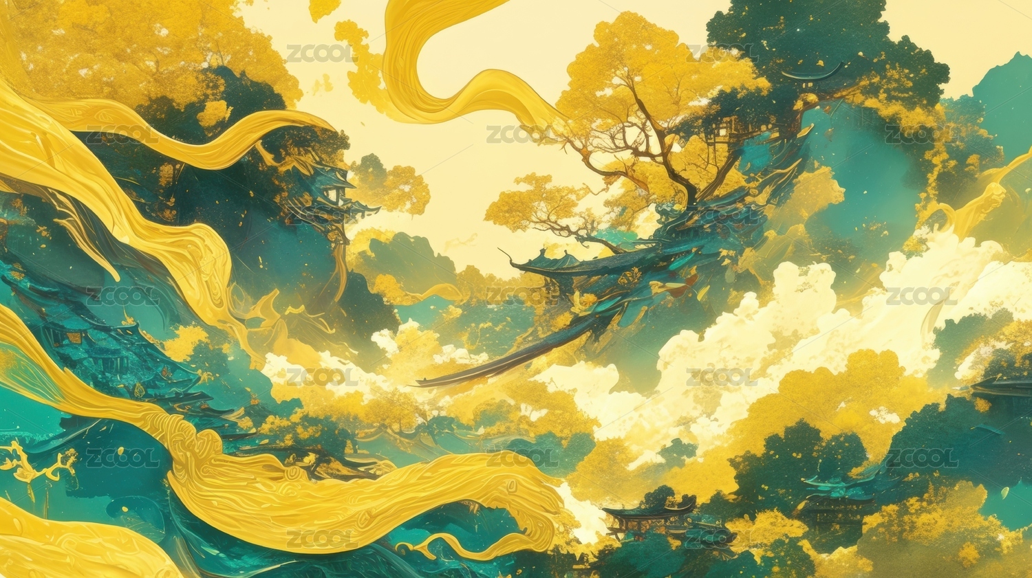 绿色山水祥云插画海报背景