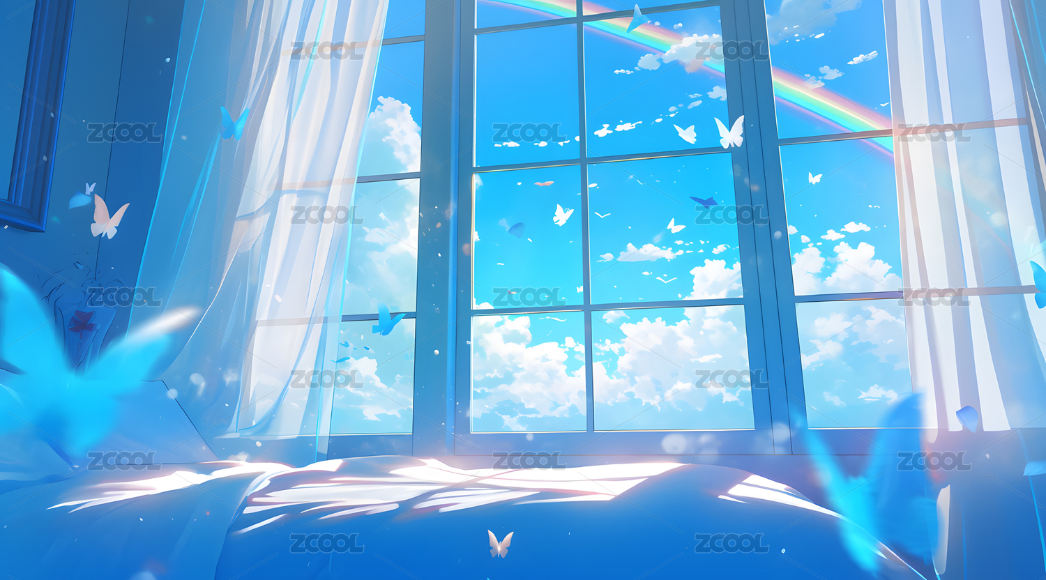 春天白天阳光下门窗外粉花绿色原野3D插画