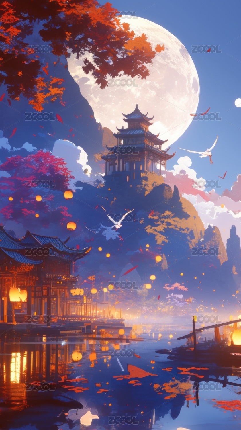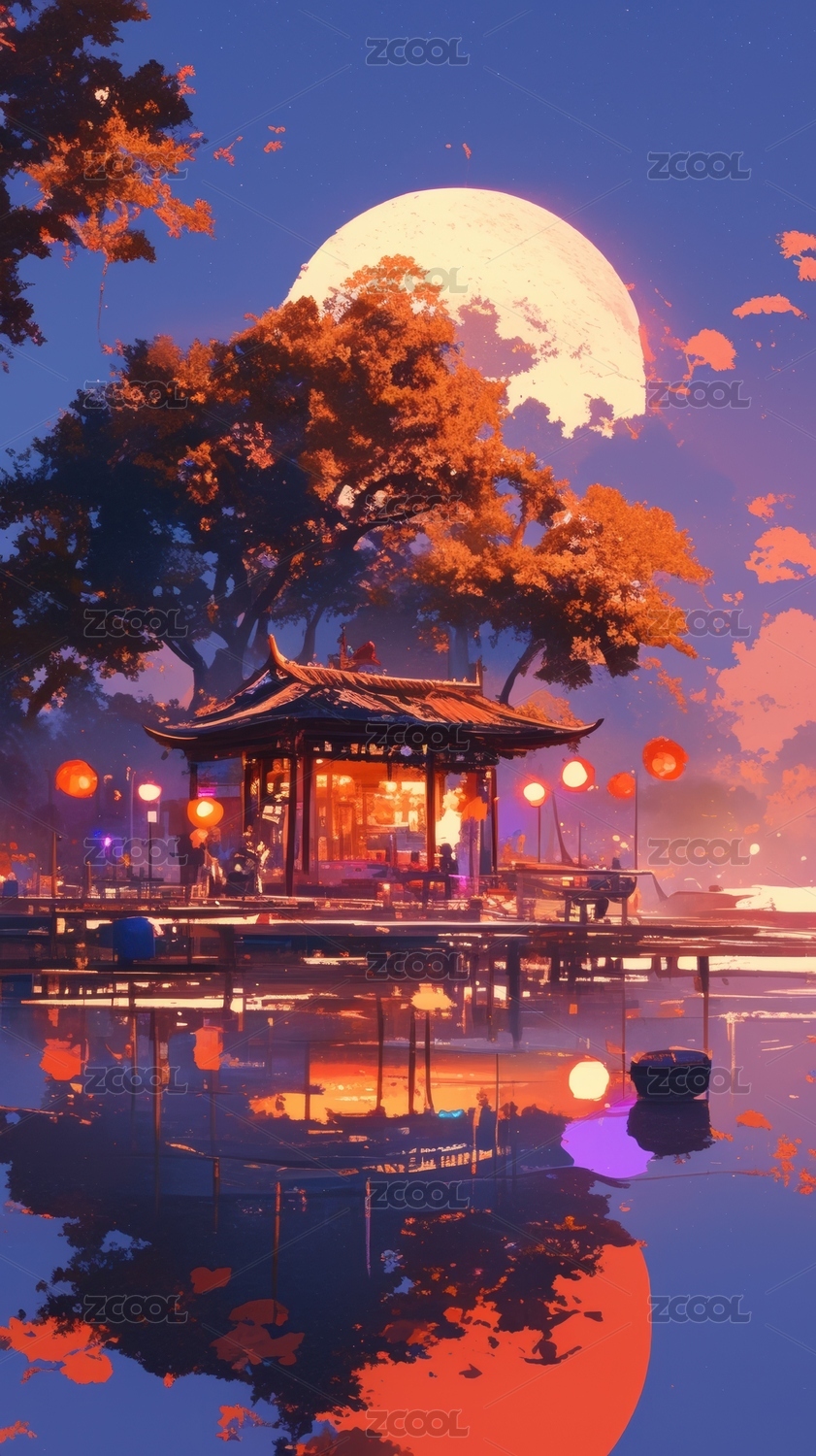 插画,卡通,夜晚,梦幻,建筑,传统,自然,和谐,风景,静谧