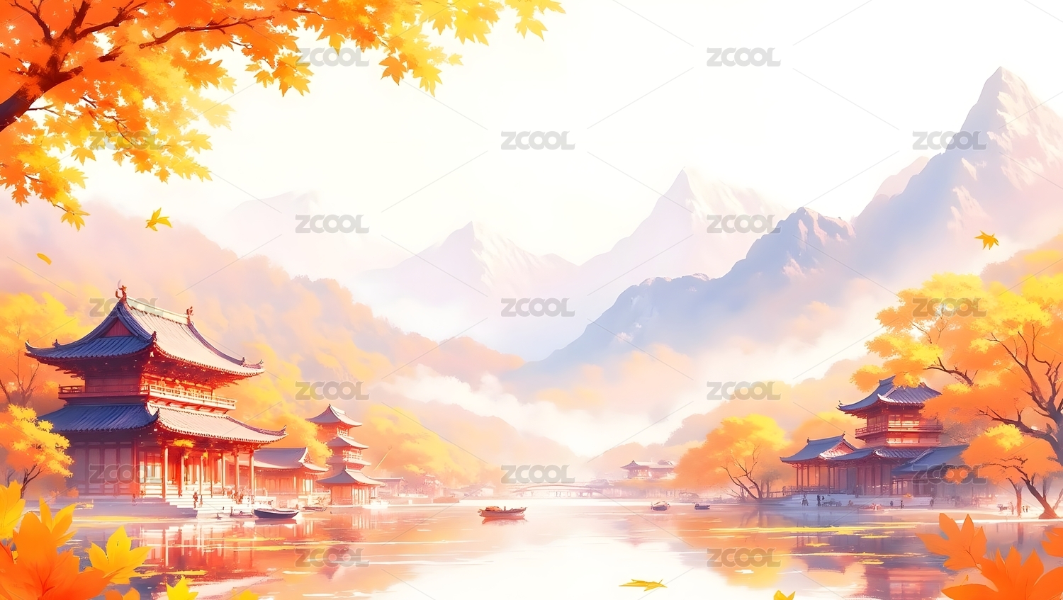 秋日古建筑湖畔风光
