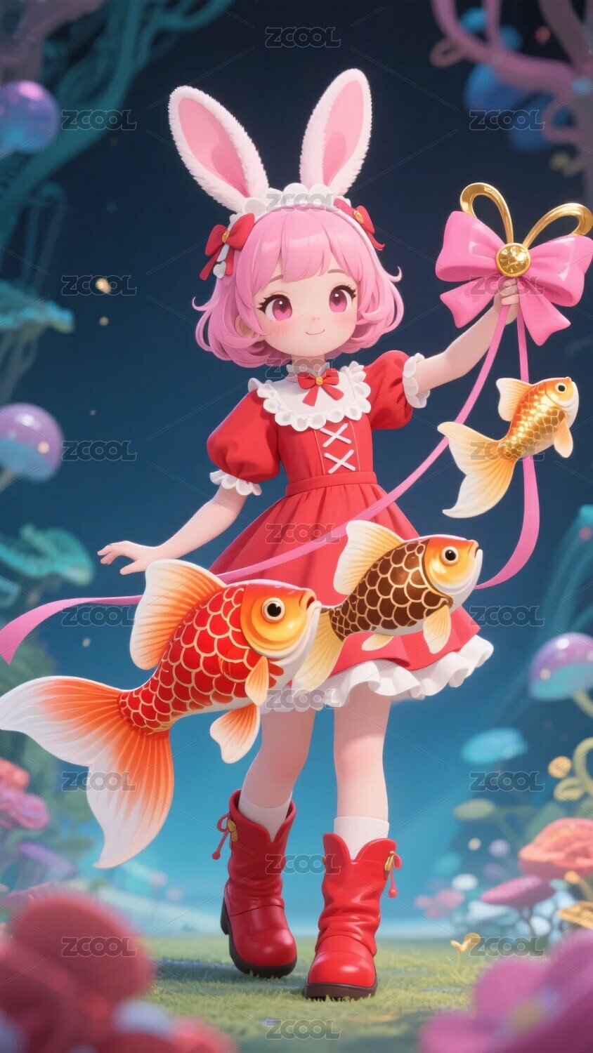 持球抱鱼的粉色长发兔耳女孩