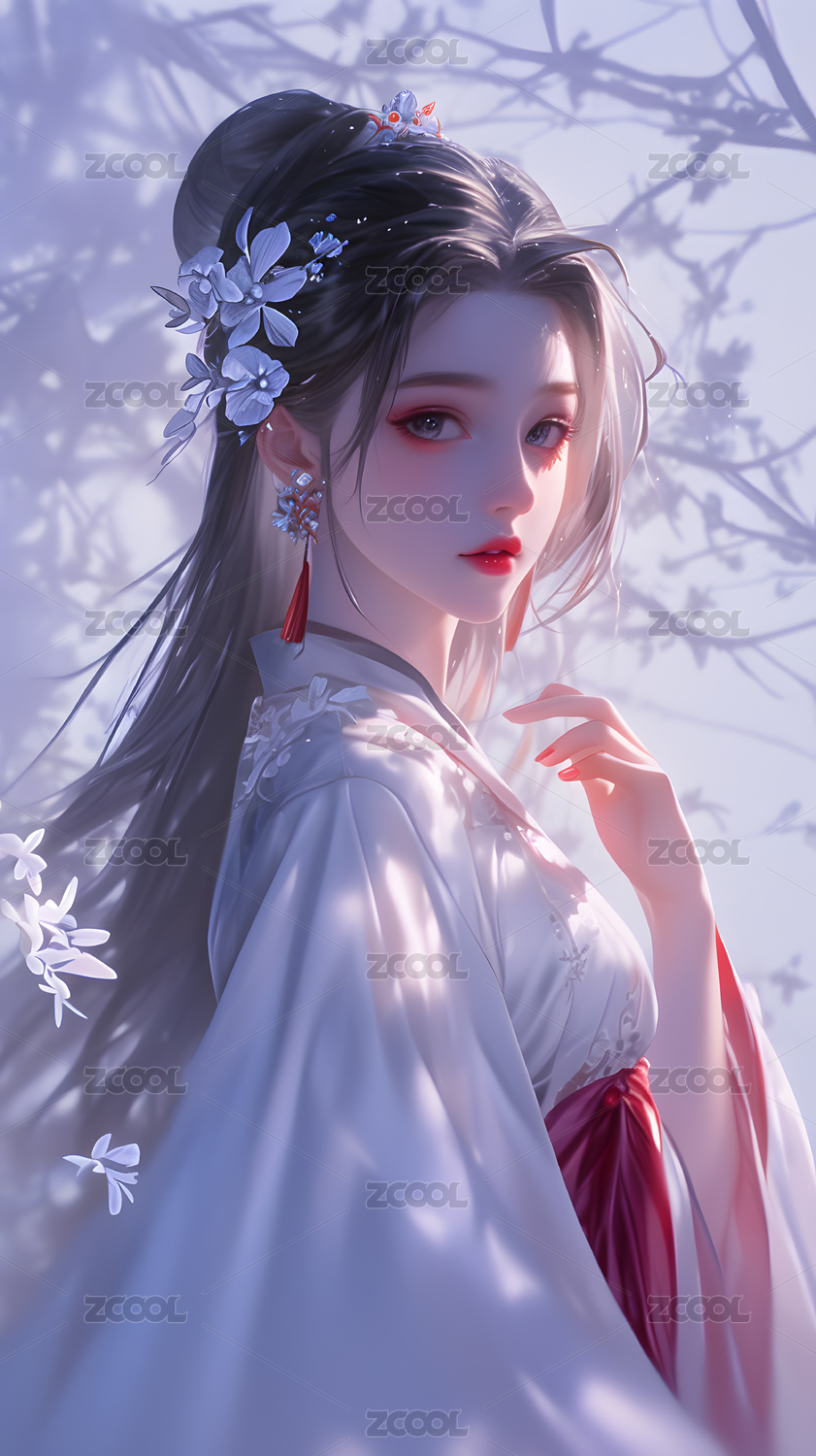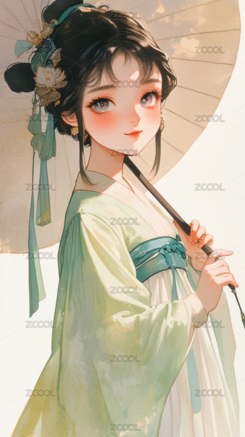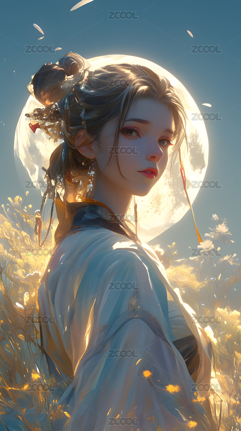 秋天金黄色落叶背景汉服女孩含情脉脉凝视