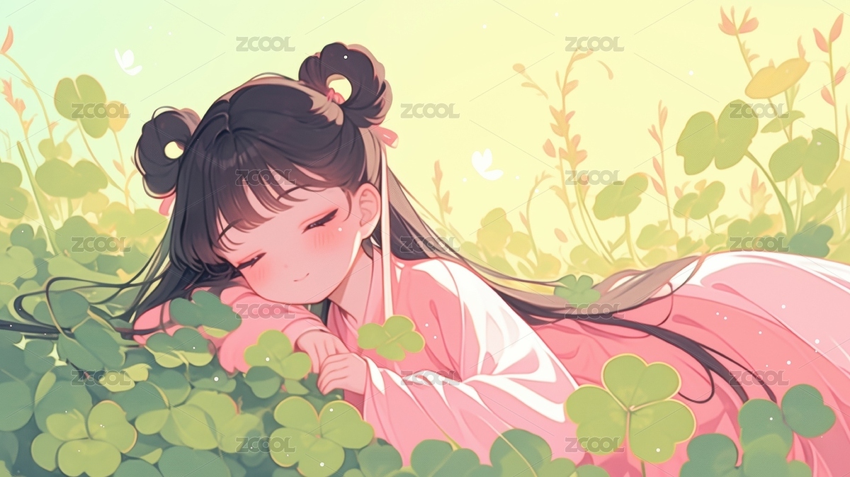 少女在四叶草中微笑
