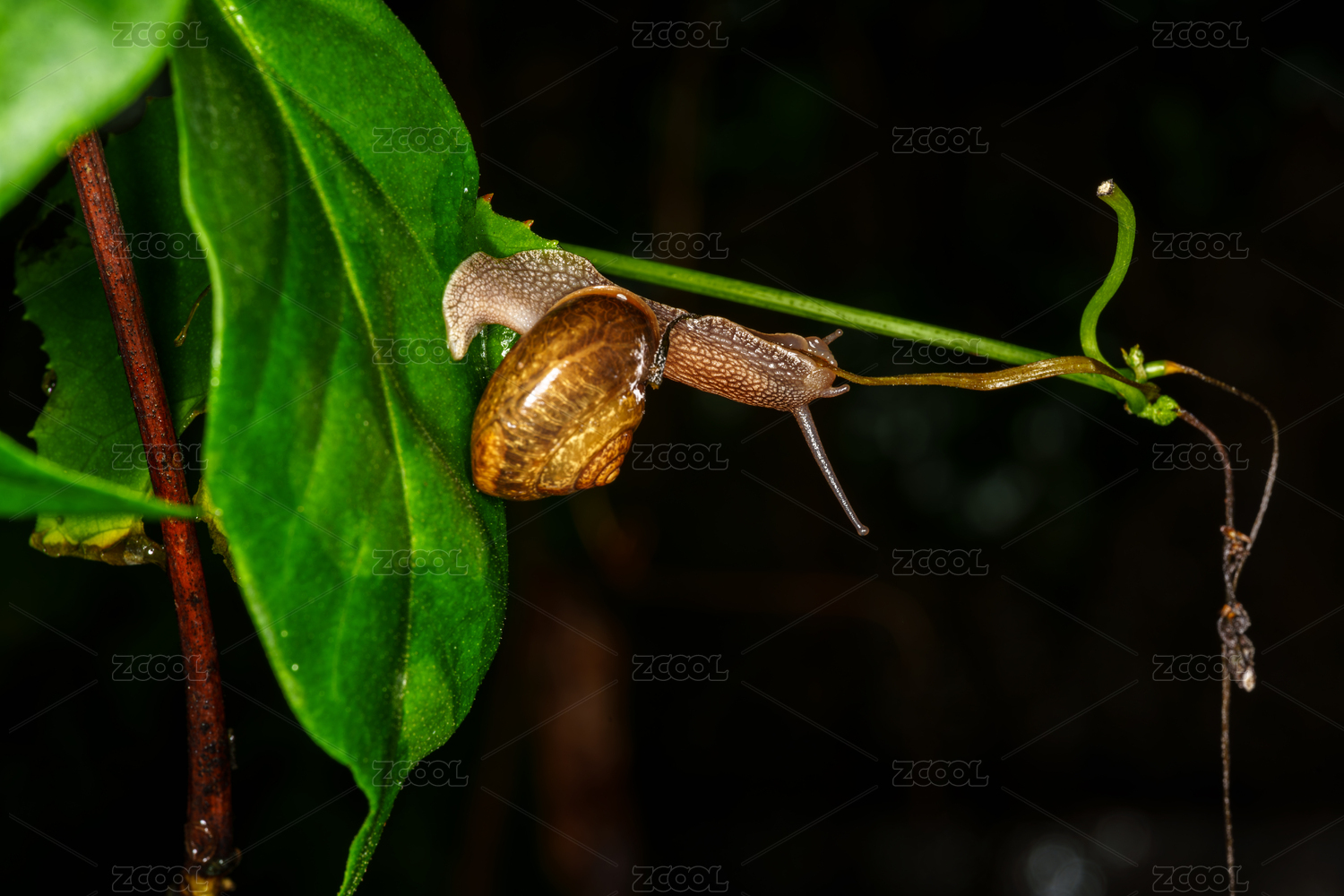 蜗牛于绿叶上的微观生态景象