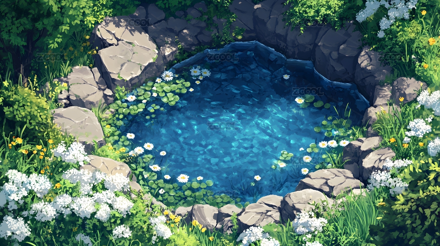 池塘鸟瞰图青色水面绿草环绕生机勃勃