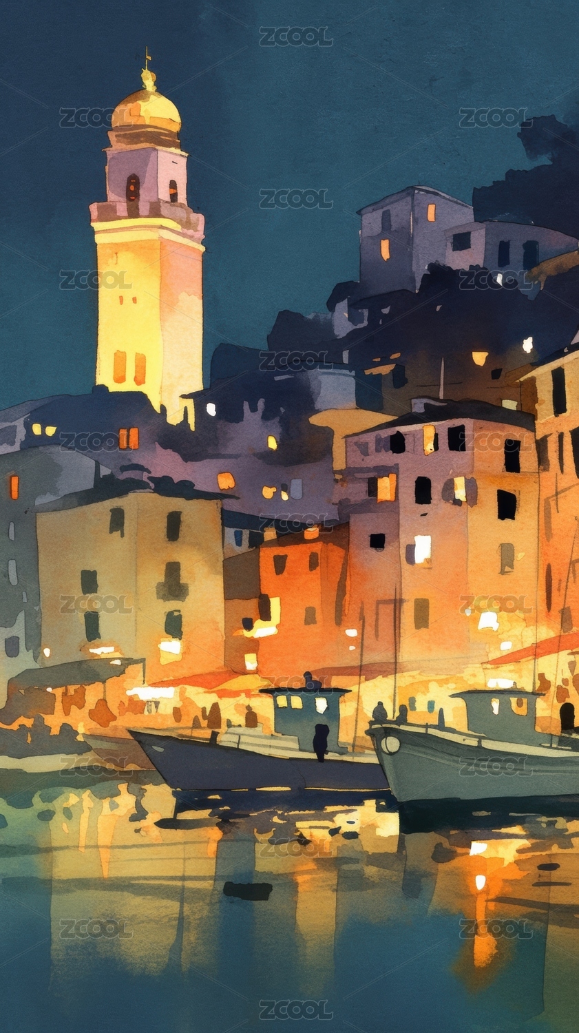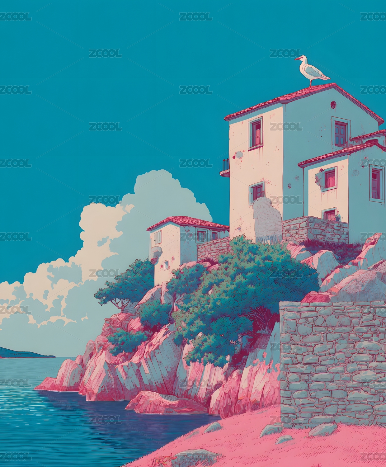 小镇,建筑,灯塔,海岸,海洋,山体,房屋,悬崖,风景,插画