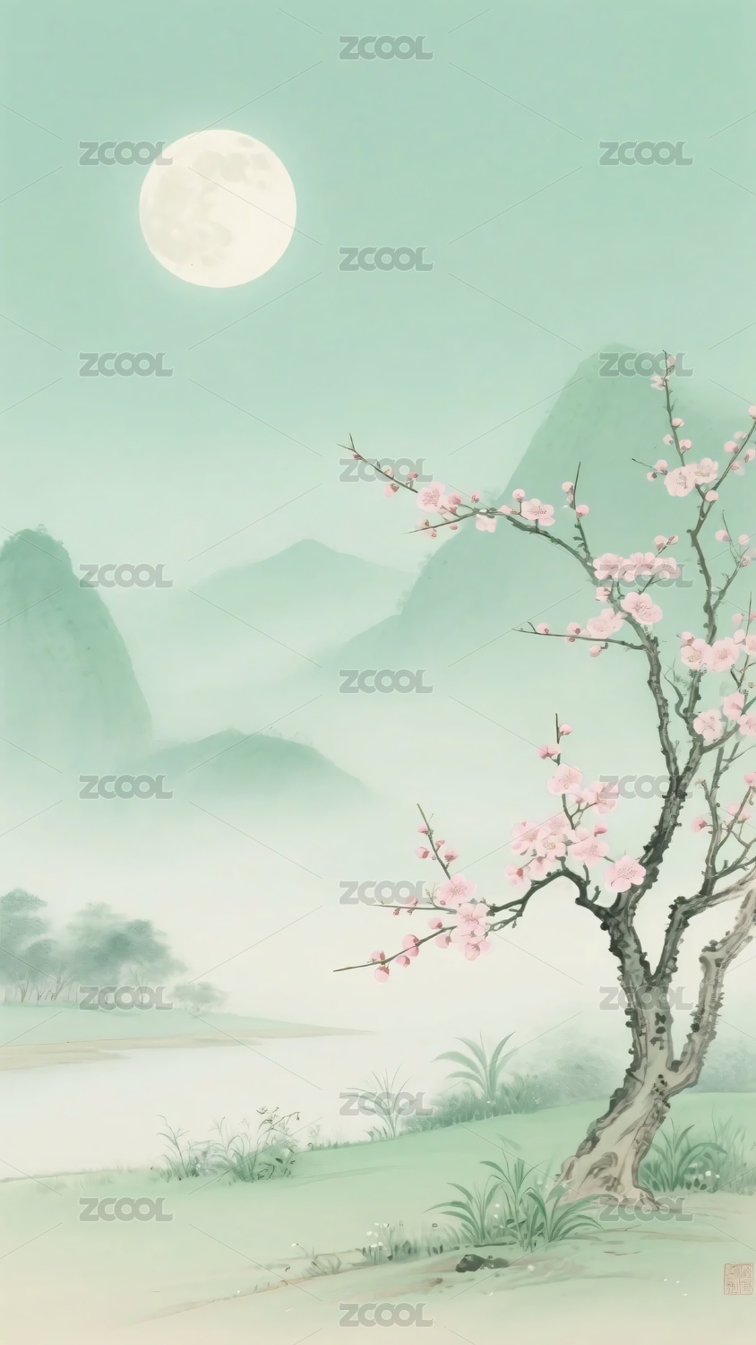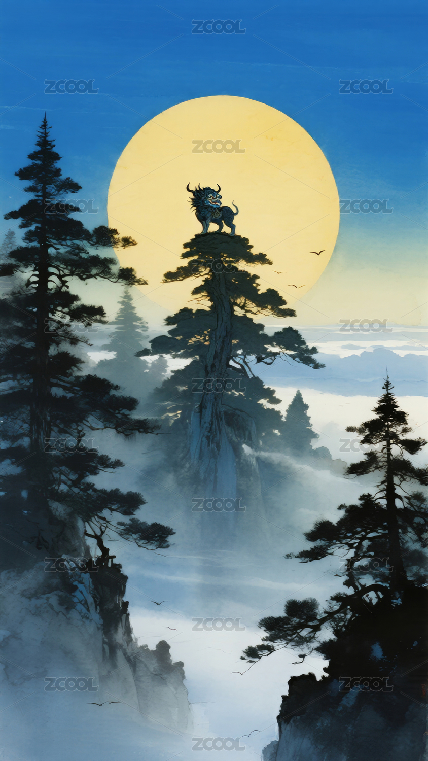 传统, 艺术, 自然, 风景, 水墨, 山峰, 静谧, 云雾,月亮, 溪流