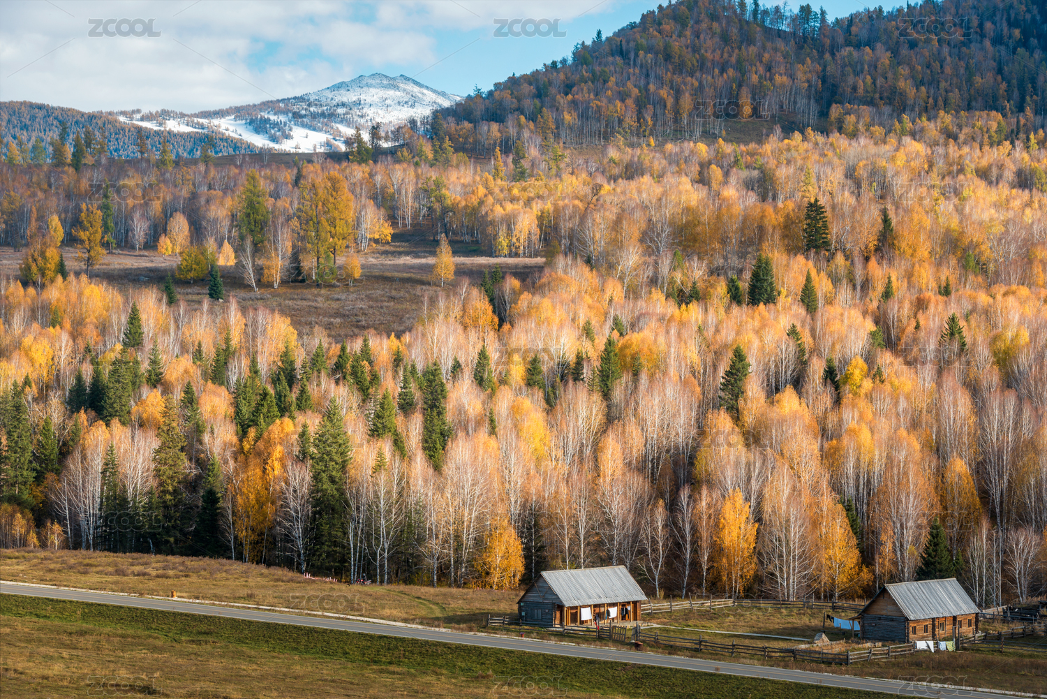 中国新疆阿勒泰禾木秋天秋色秋景雪景风光