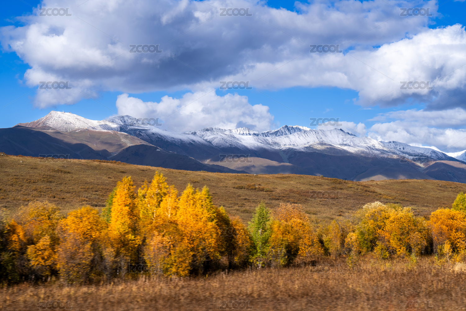 秋天黄色的松树与雪山 中国新疆哈密白石头