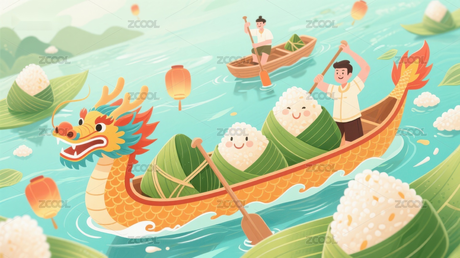 端午节龙舟与粽子的欢乐场景