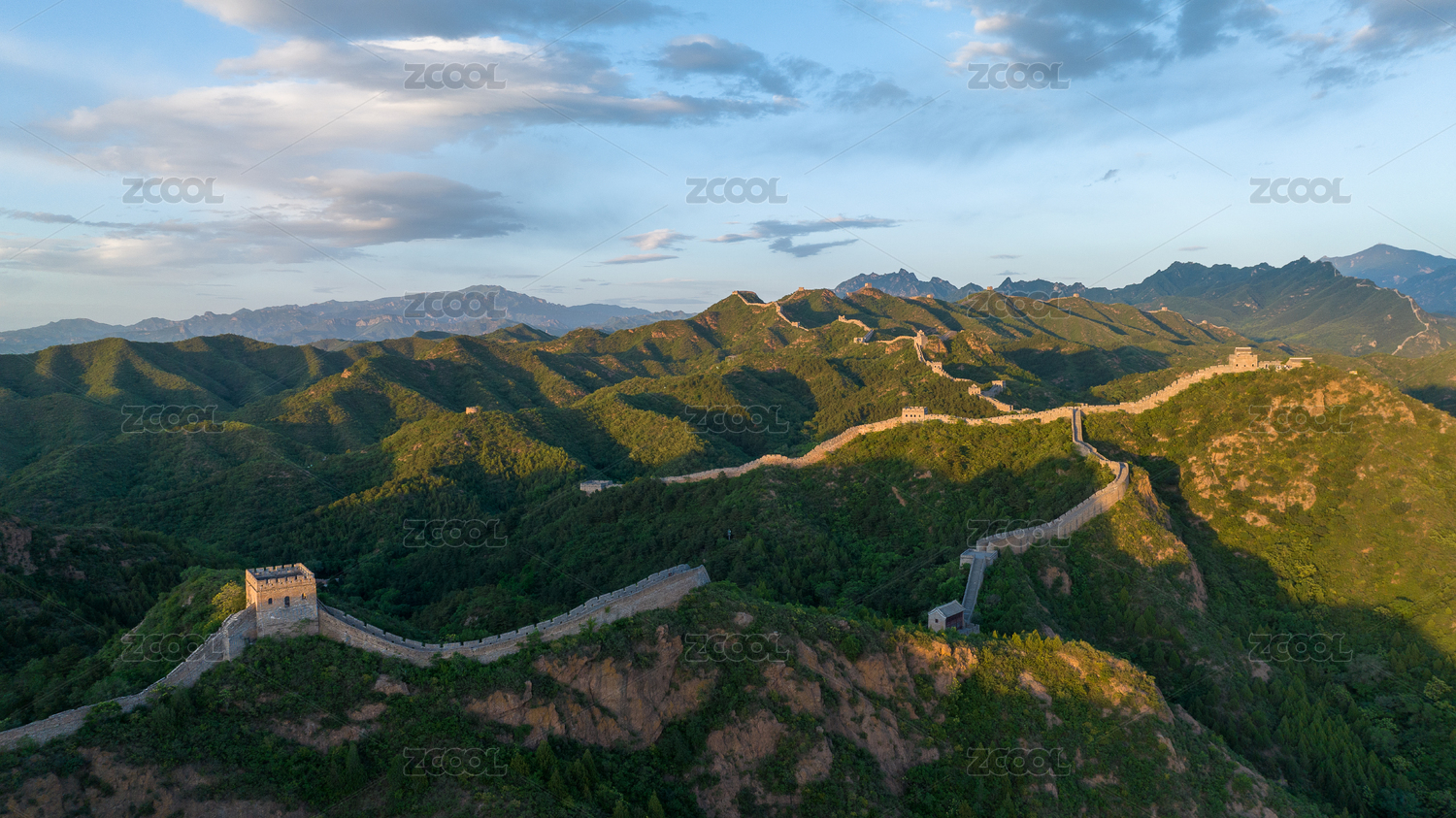 夏季夕阳照耀中国金山岭长城烽火台好风光