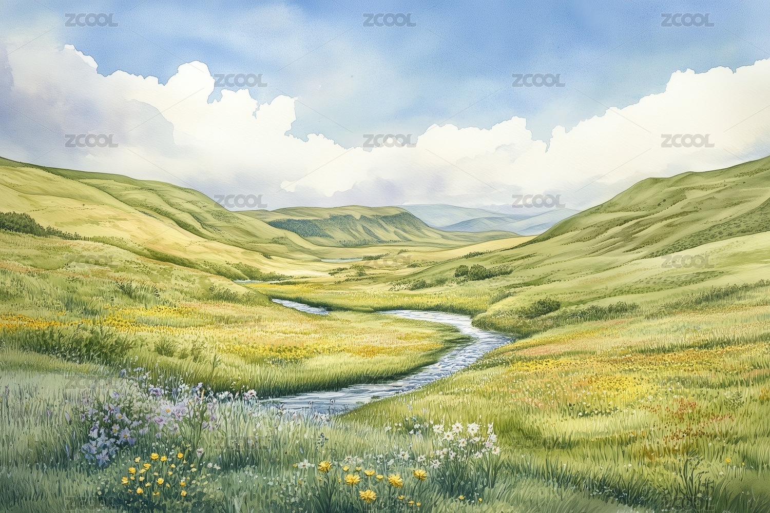 水彩风格草原湿地风光