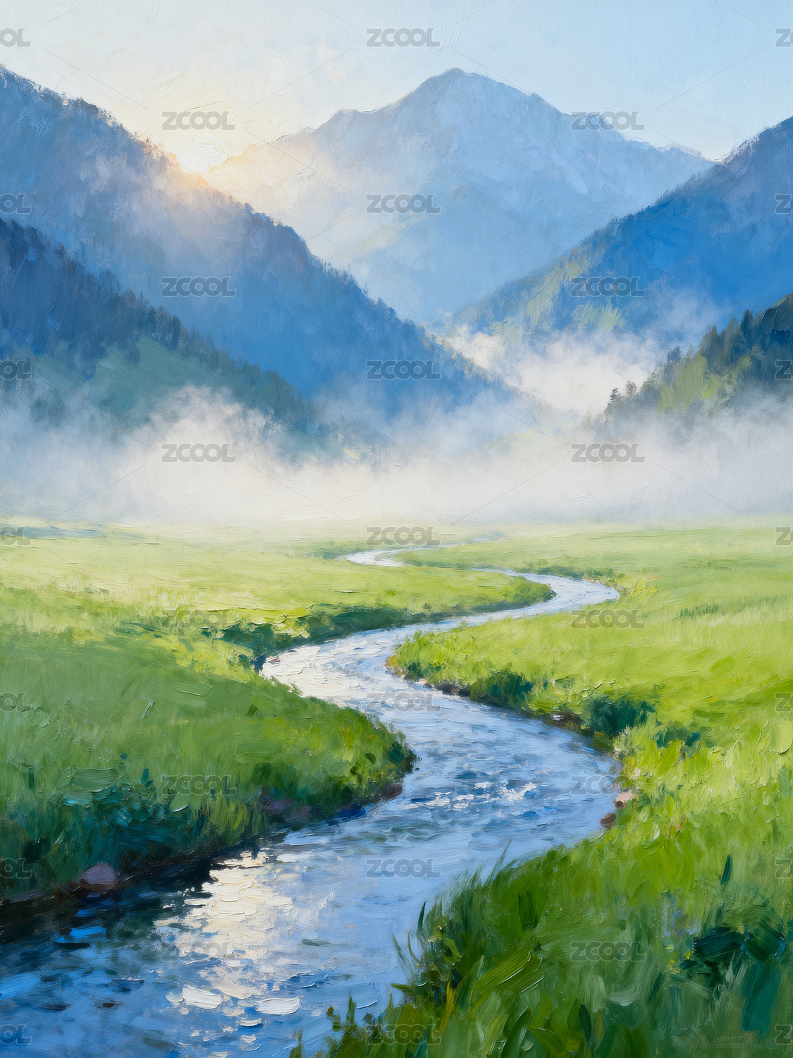 晨曦山间溪流绿意盎然