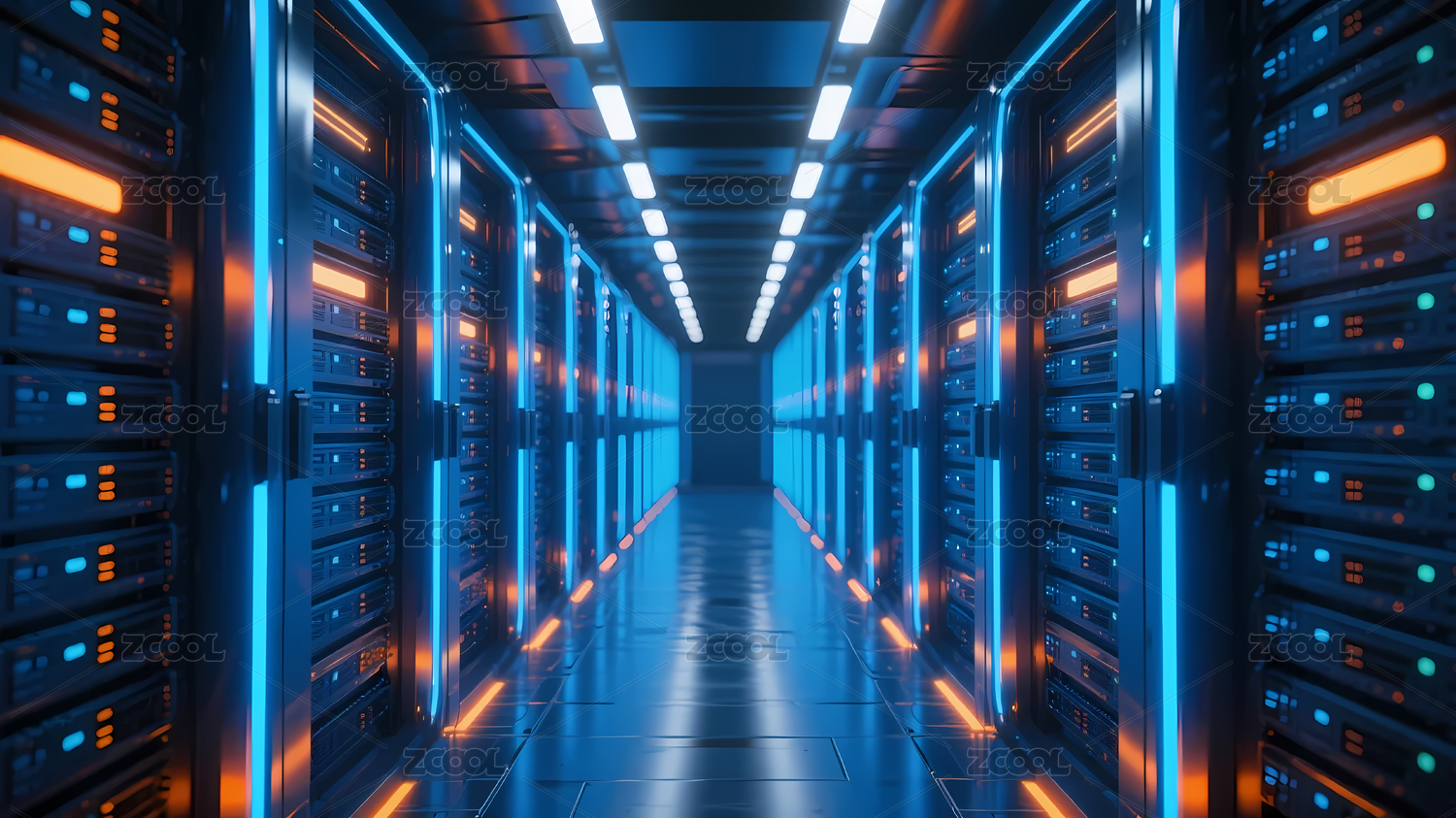 蓝橙灯光点缀服务器走廊