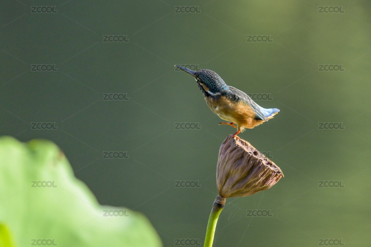 落在莲蓬上的一只翠鸟