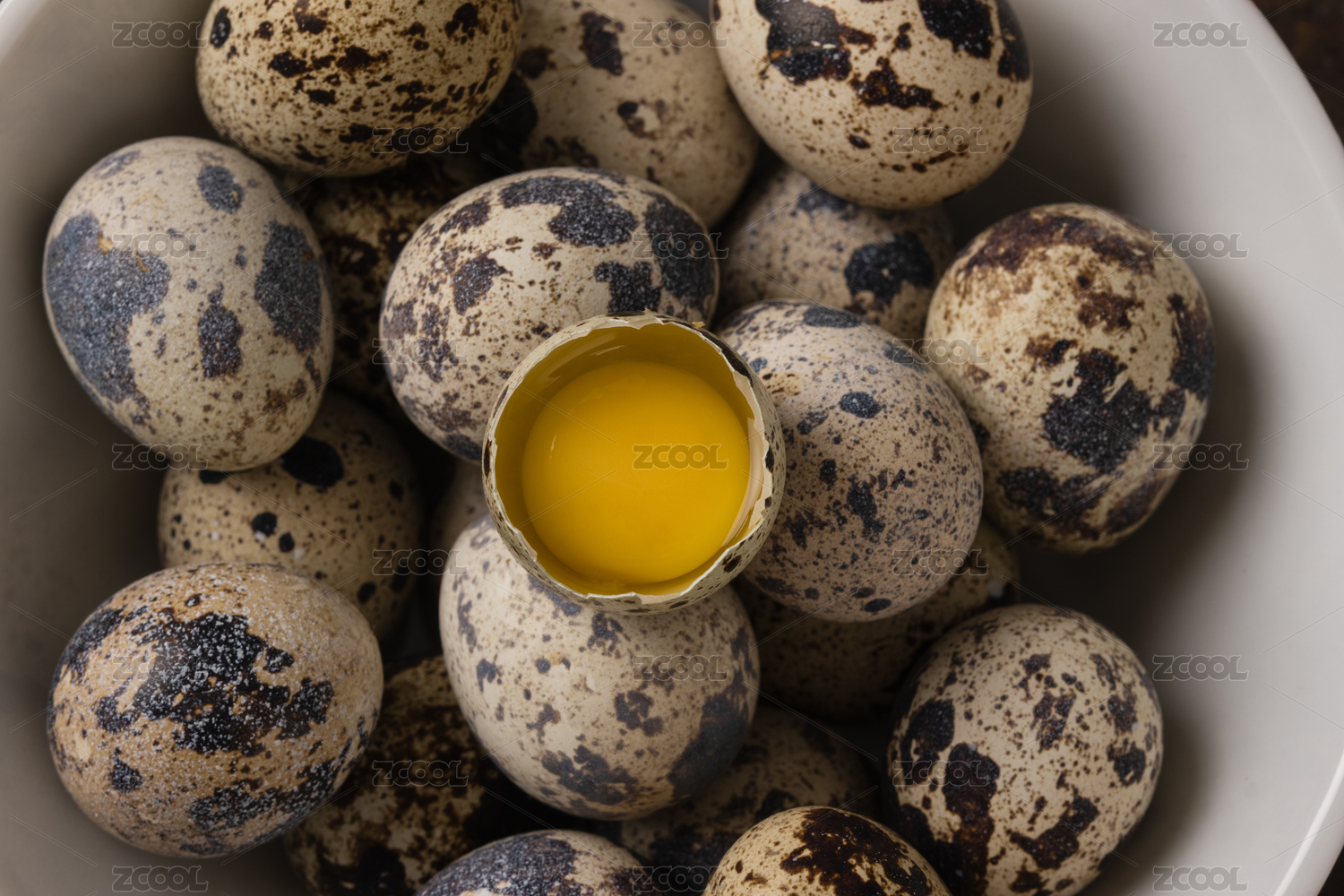 一堆原生态鹌鹑蛋和一个打开的鹑鸟蛋