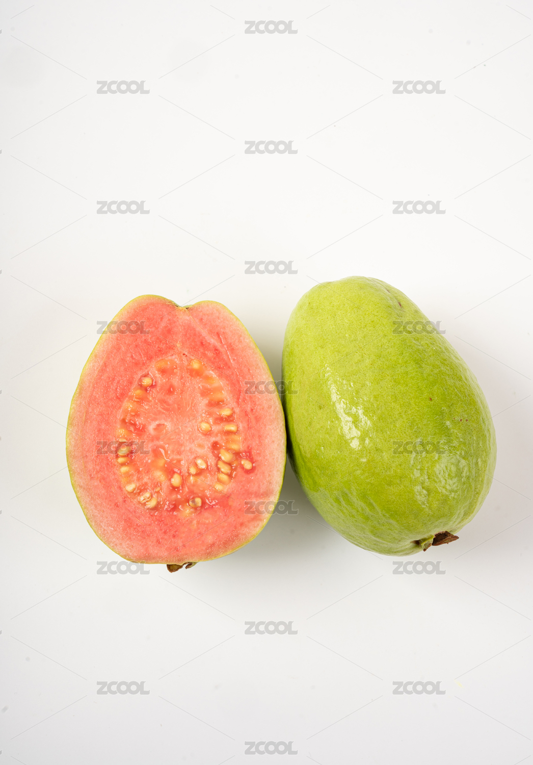 白底上的一个完整的红心芭乐和一个有切面的红心芭乐