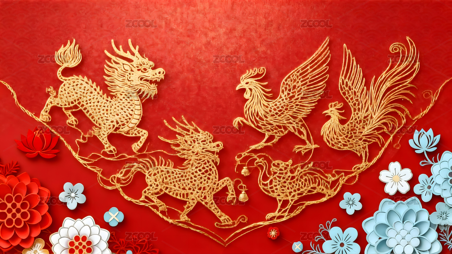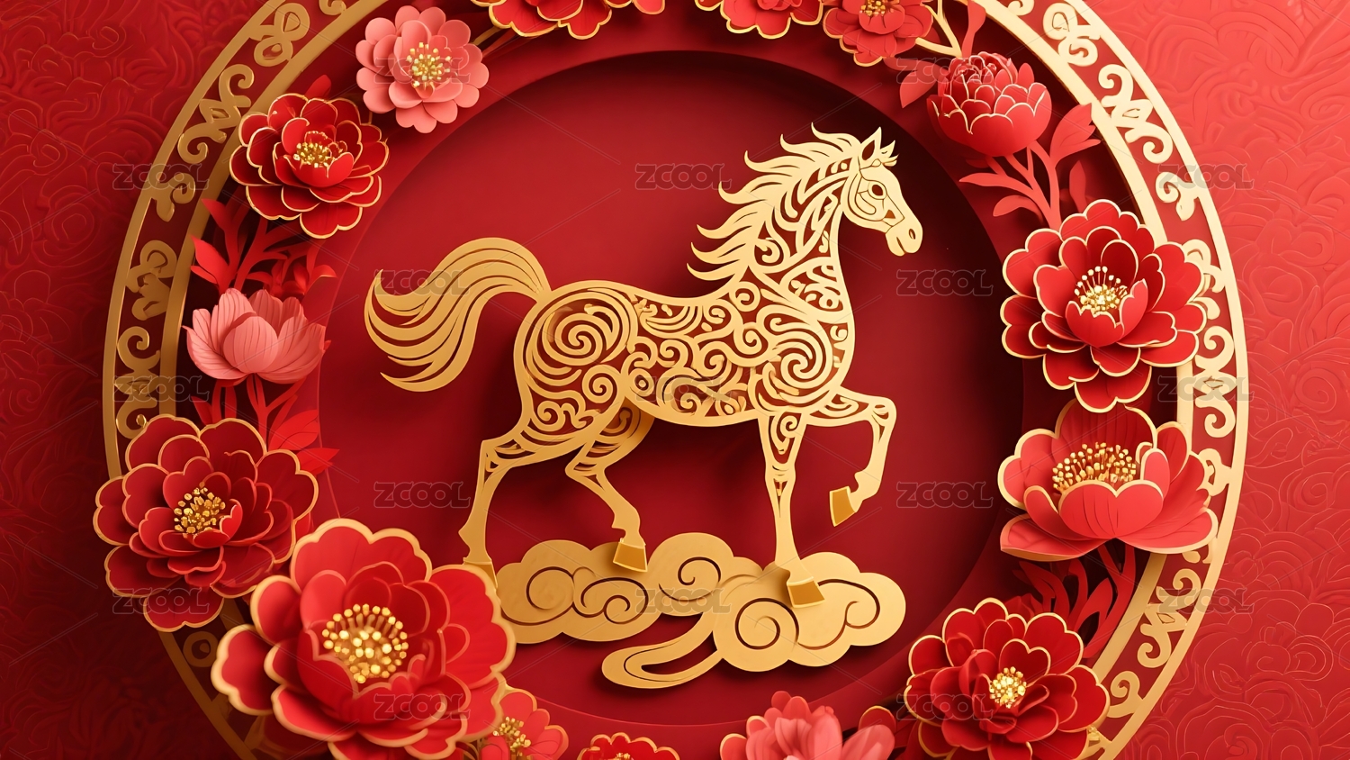 装饰,背景,马,云,花,红色,图案,立体,花朵,传统