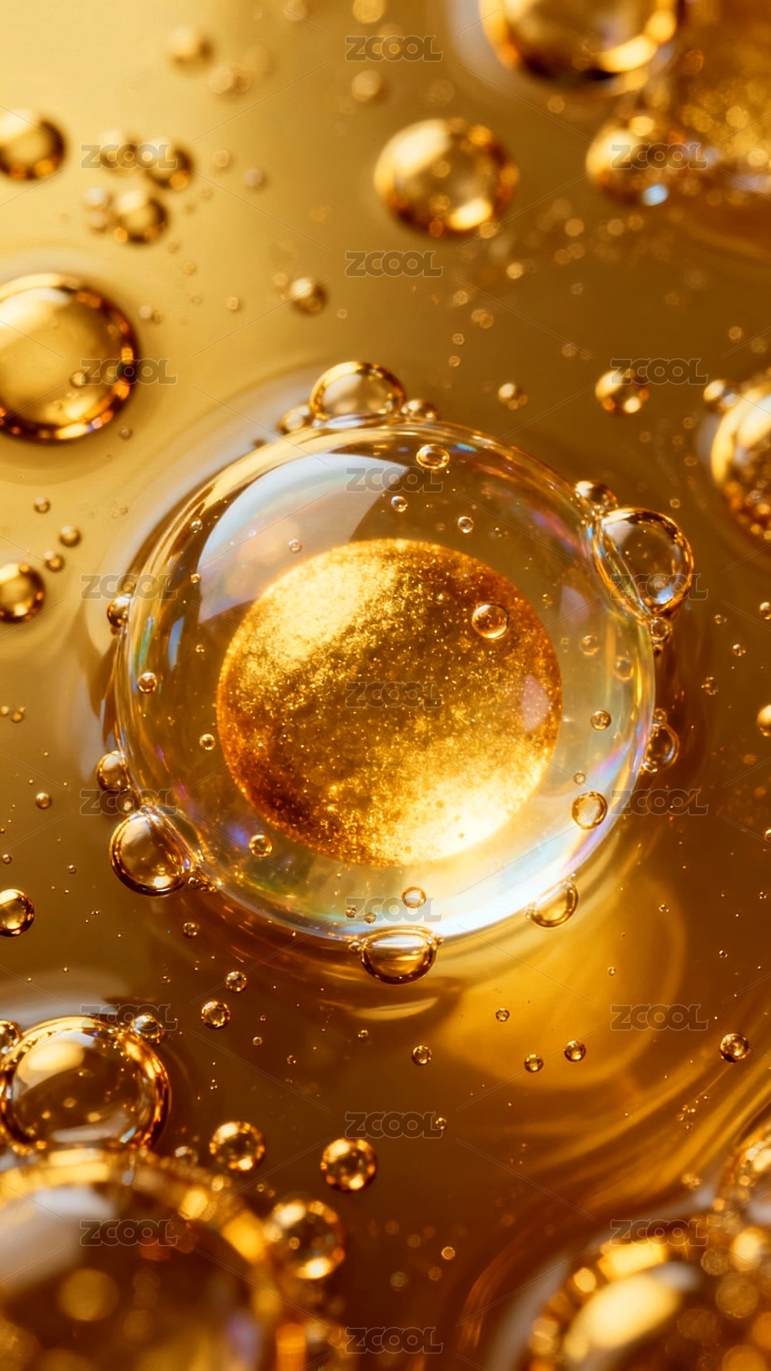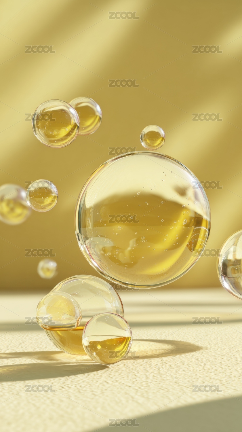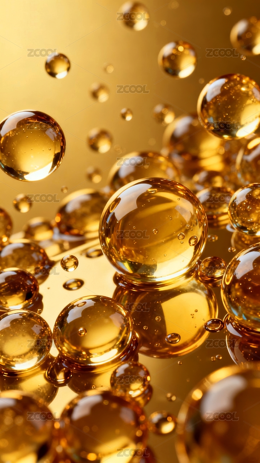 金色液体气泡悬浮在柔和背景中