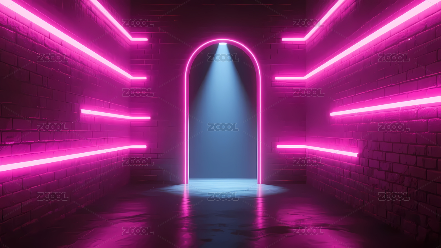 砖墙,灯光,霓虹,光影,墙面,地面,反射,紫色,蓝色,空旷