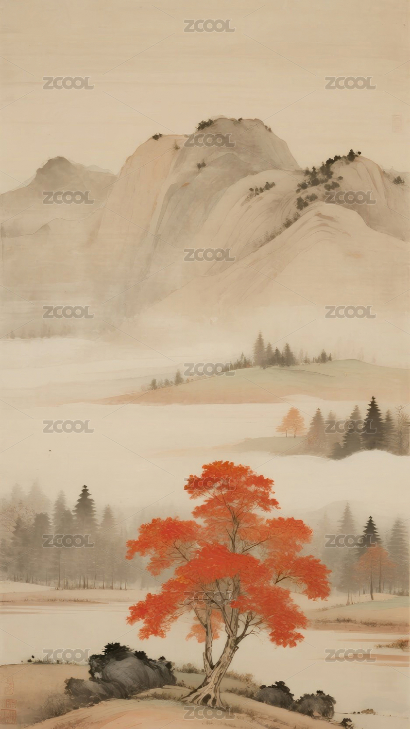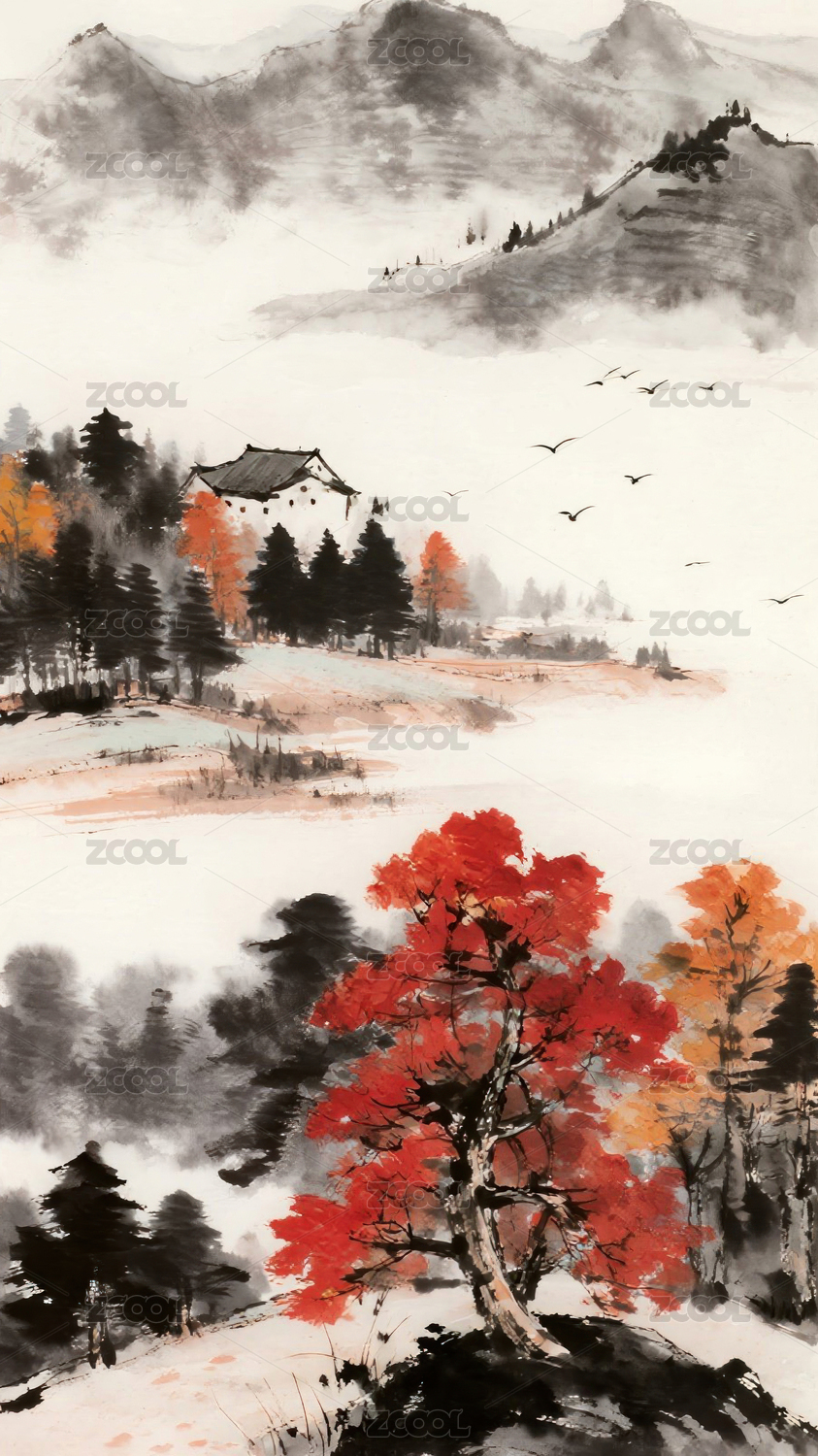 山间红叶水墨意境秋山红树云雾缭绕山水国画