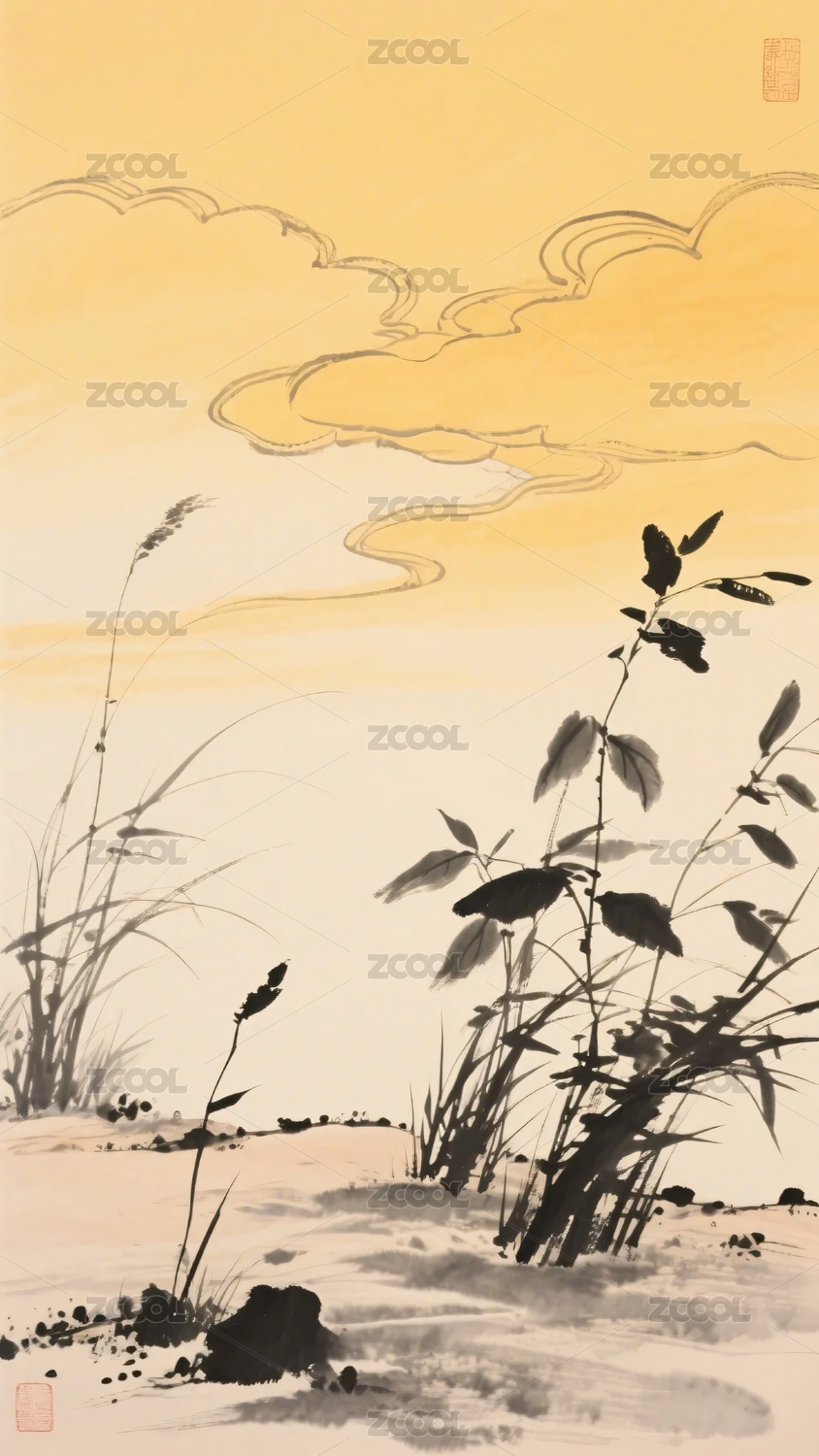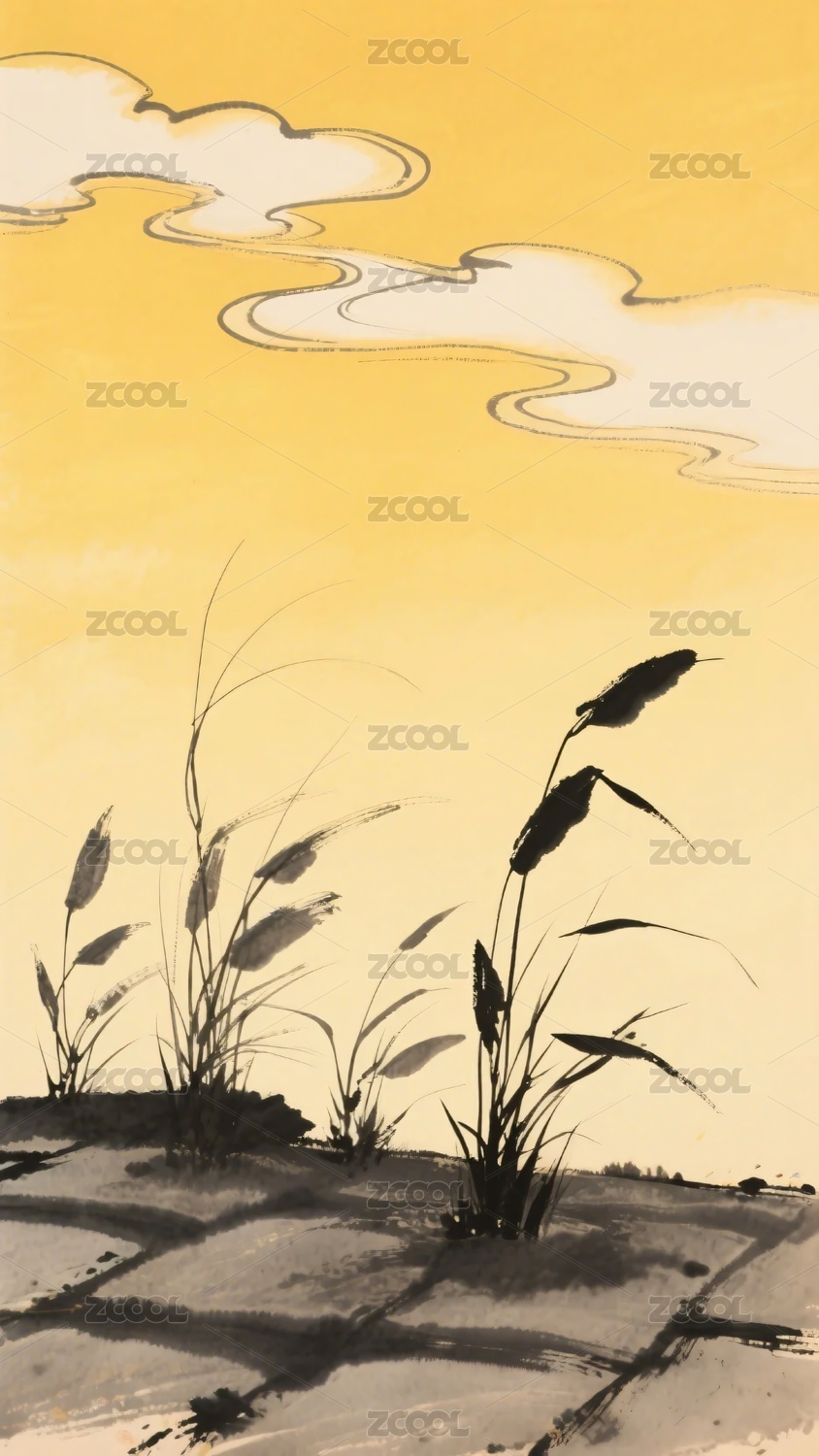 水墨风芦苇云彩风景图
