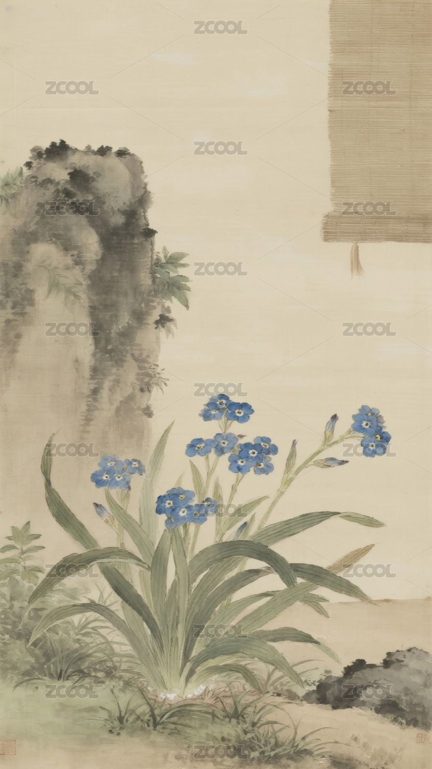 山石旁的蓝花
