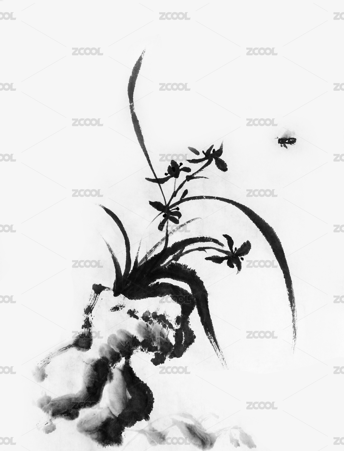 石头兰花中国水墨画