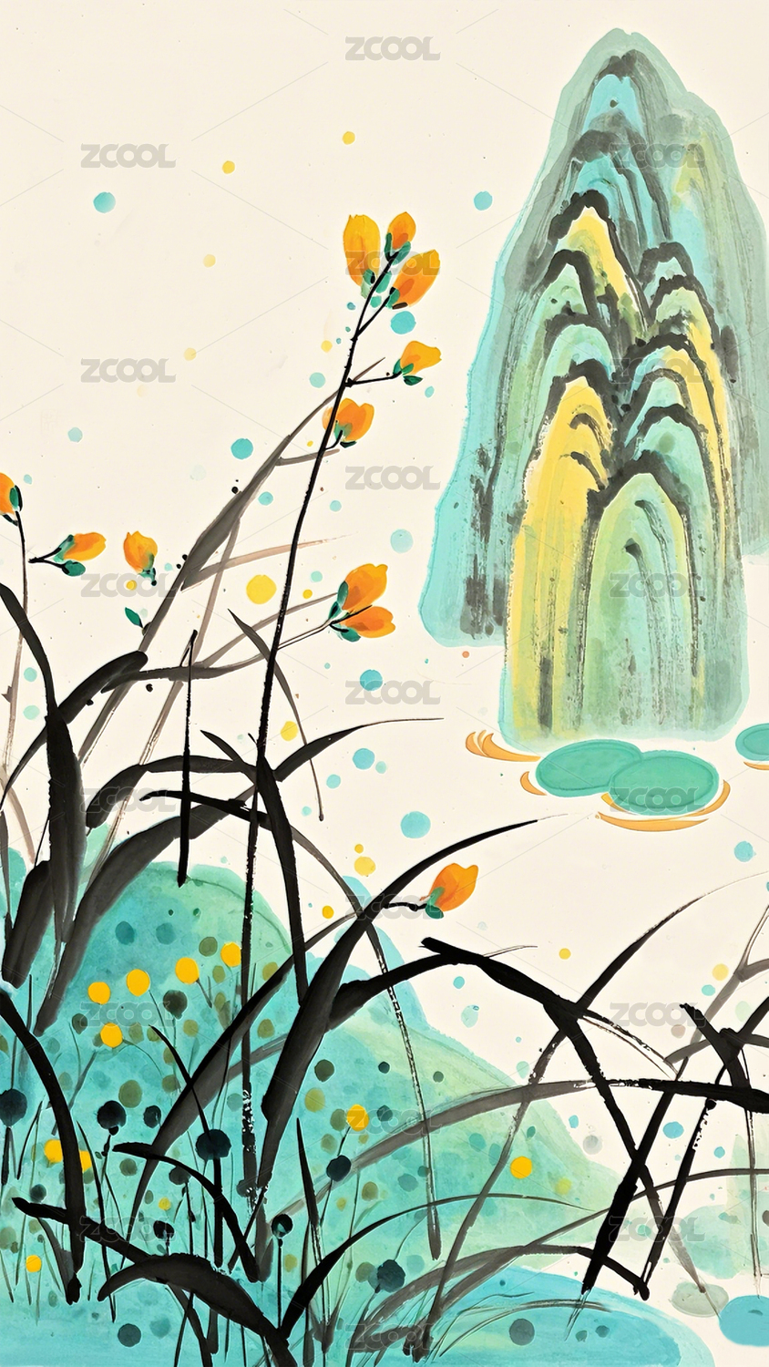 墨兰绘的橙花岩石