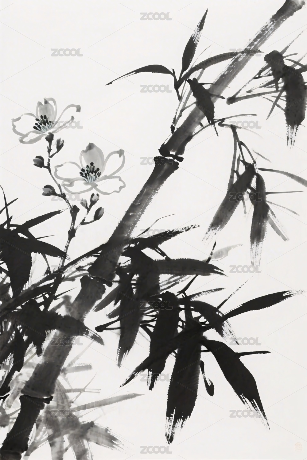 水墨画竹与花