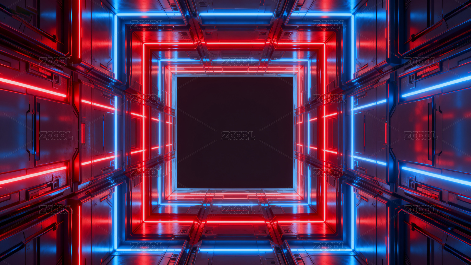 蓝色,霓虹灯,隧道,未来感,红色,光框,科技感,深黑,明亮,纵深感