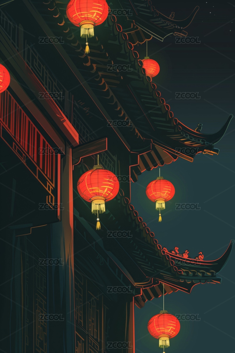 夜晚挂着传统红灯笼的中国古典建筑插画绘画
