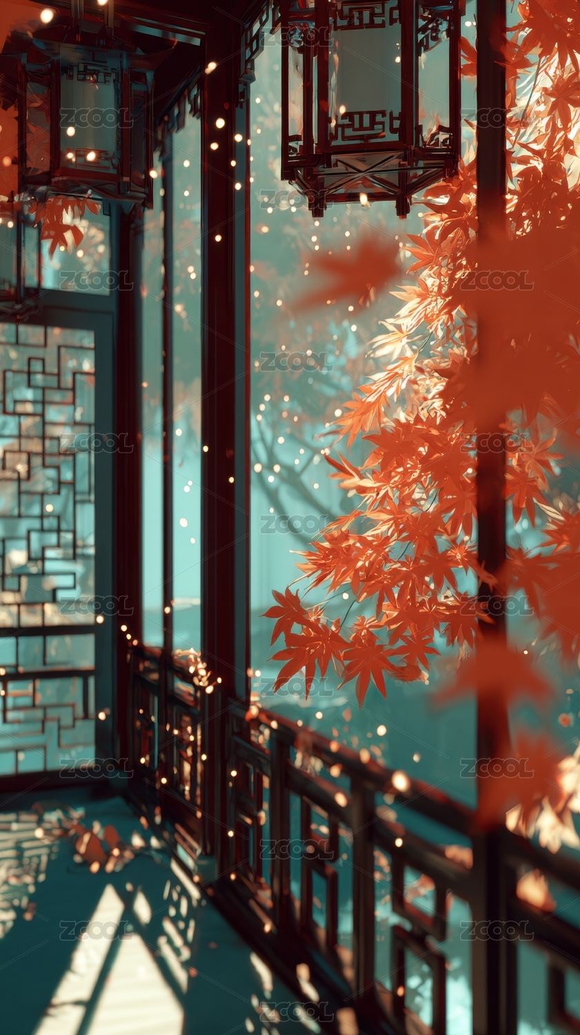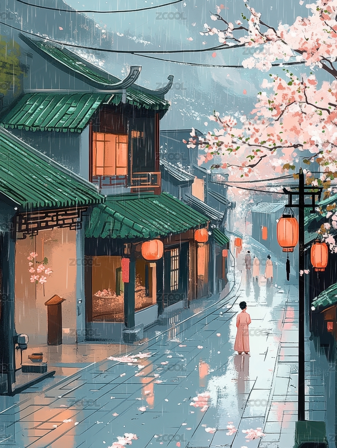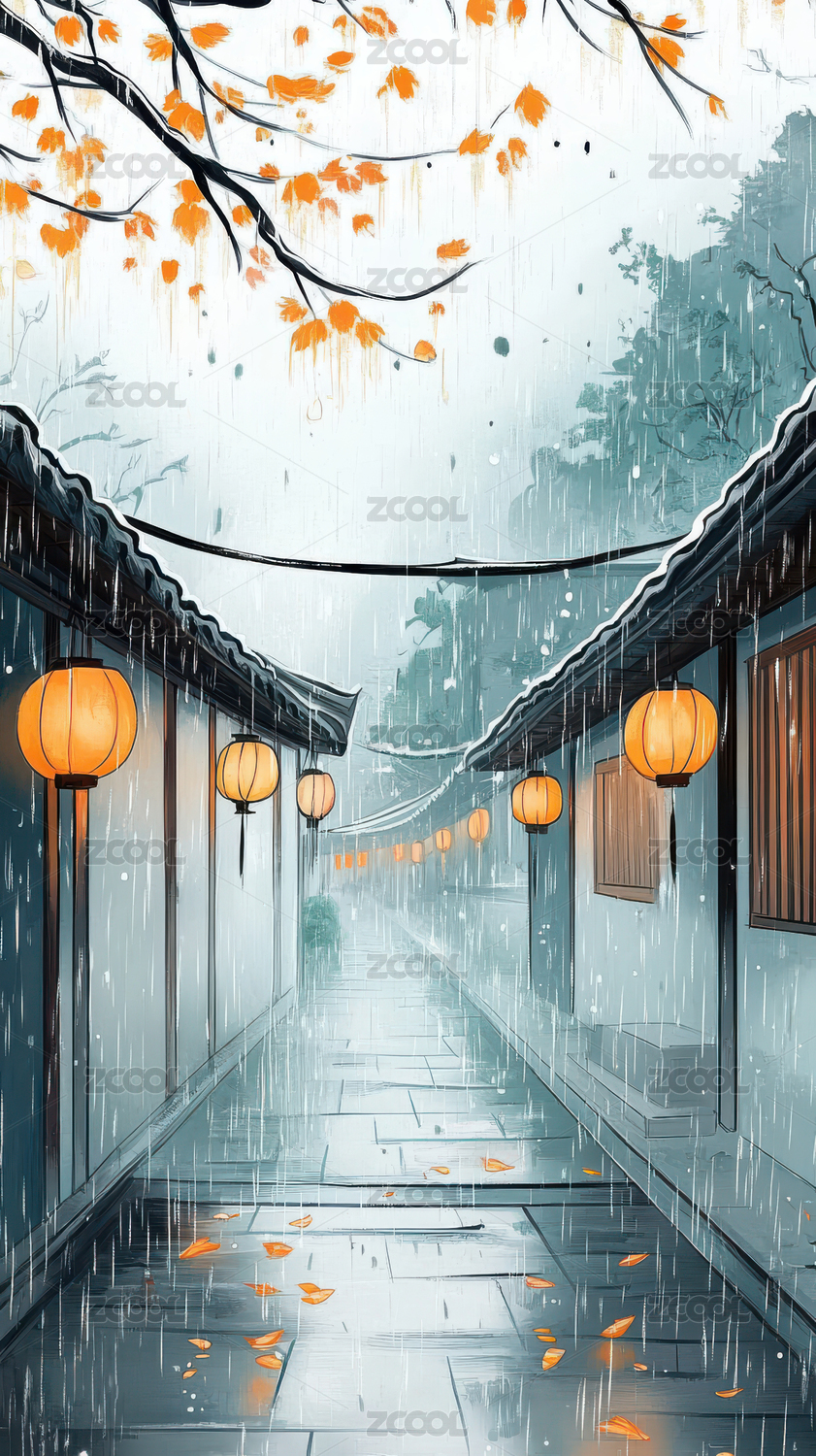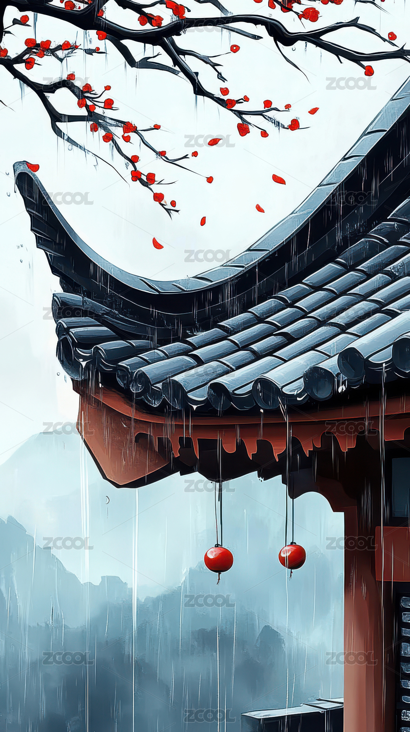 中式屋檐,灯笼,雨景,插画,古风,植物,元素,建筑,传统,装饰