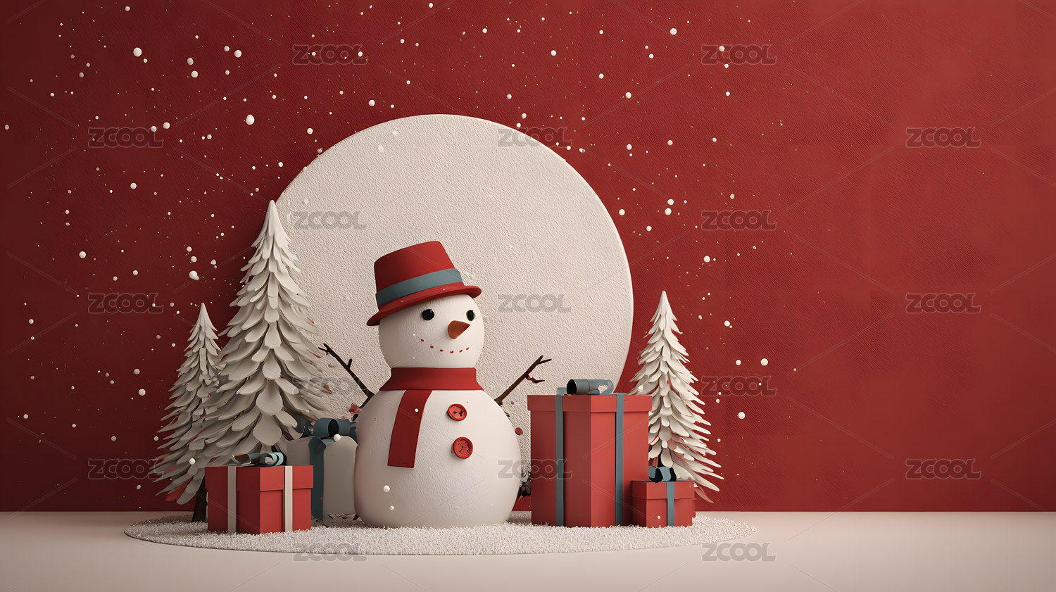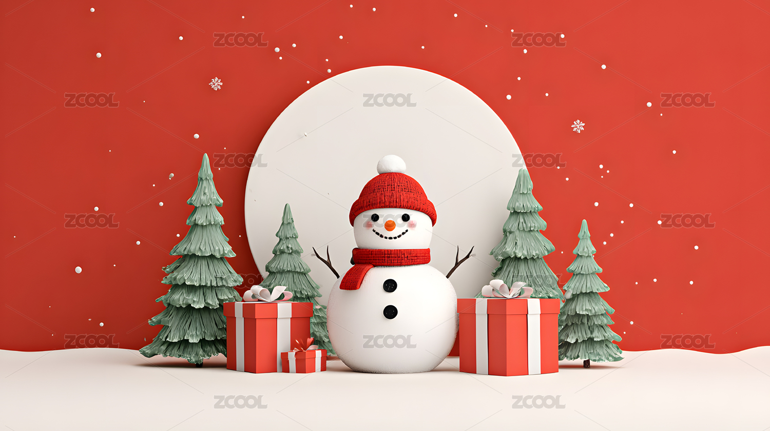 雪人,圣诞帽,红围巾,笑脸,雪地,圣诞树,礼物盒,雪花,红色背景,白色