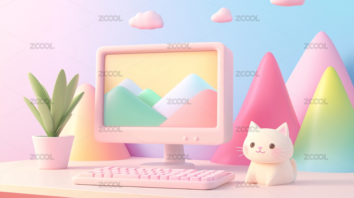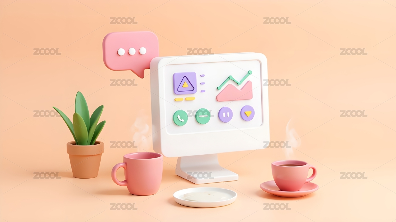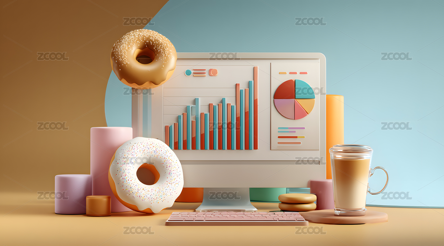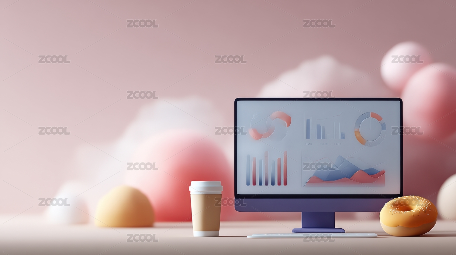 电脑,键盘,甜甜圈,咖啡杯,纸杯咖啡,图表,粉色背景,桌面,办公用品,甜点