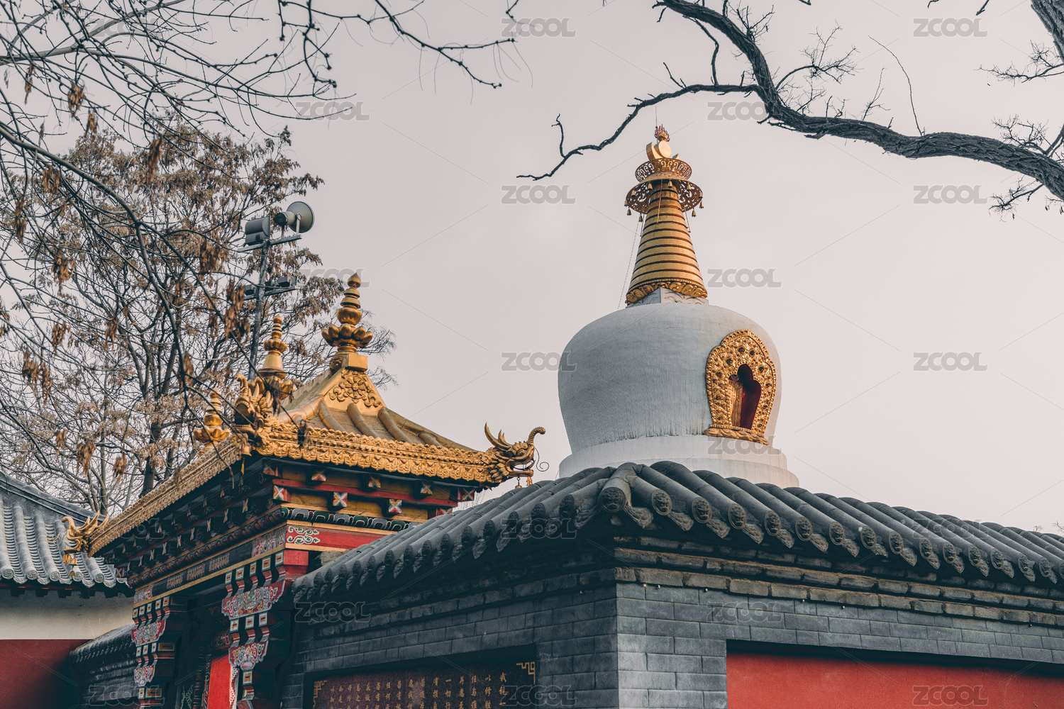 秋天北京五塔寺建筑与石刻石碑雕像