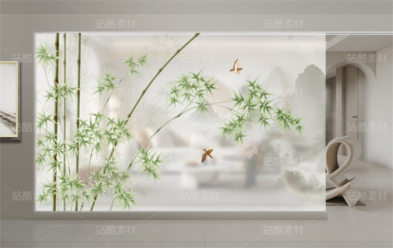 抽象竹鸟装饰画 新中式竹子画 朦胧竹子 适用于家装,酒店,文化场所等,用于做:背景墙、隔断、移门,屏风、玄关。高清分层图可以用UV打印。