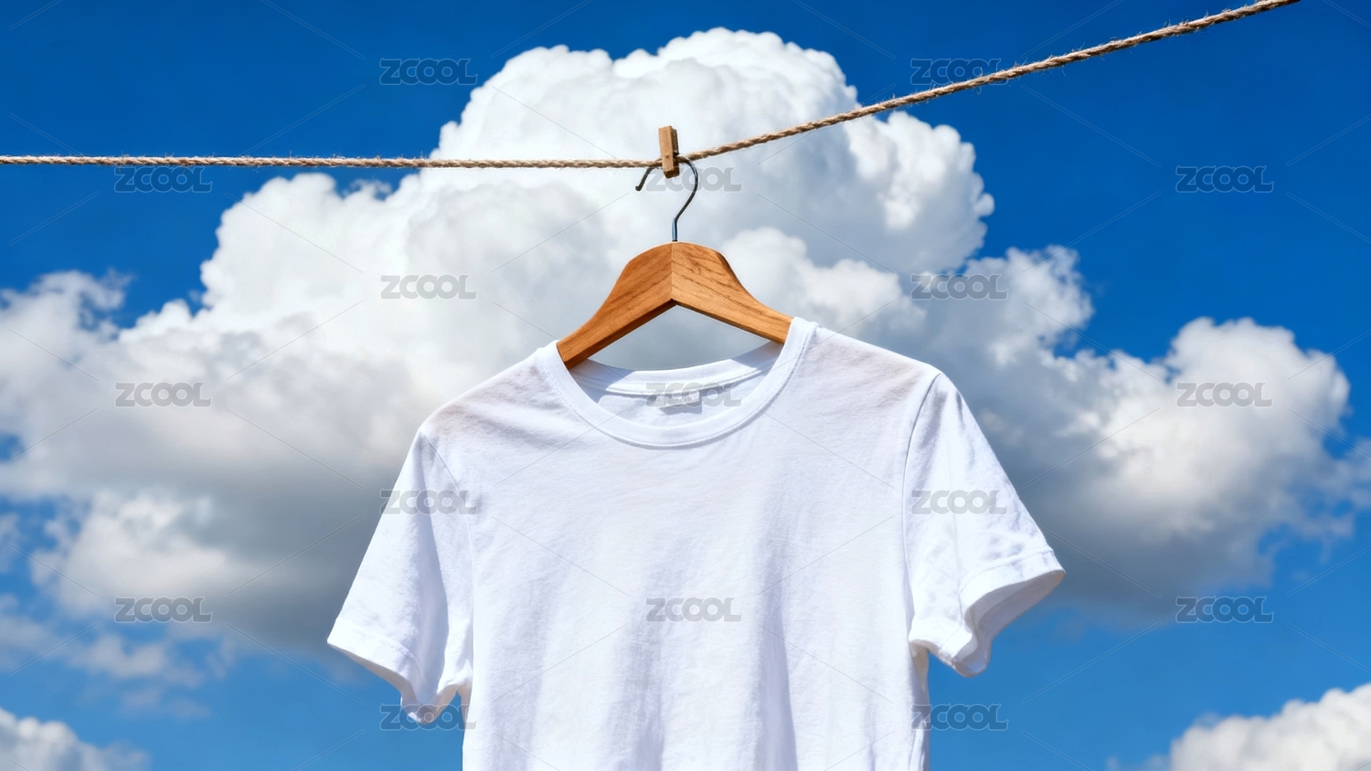 白色T恤与两件衣物悬挂于蓝天下的晾衣绳