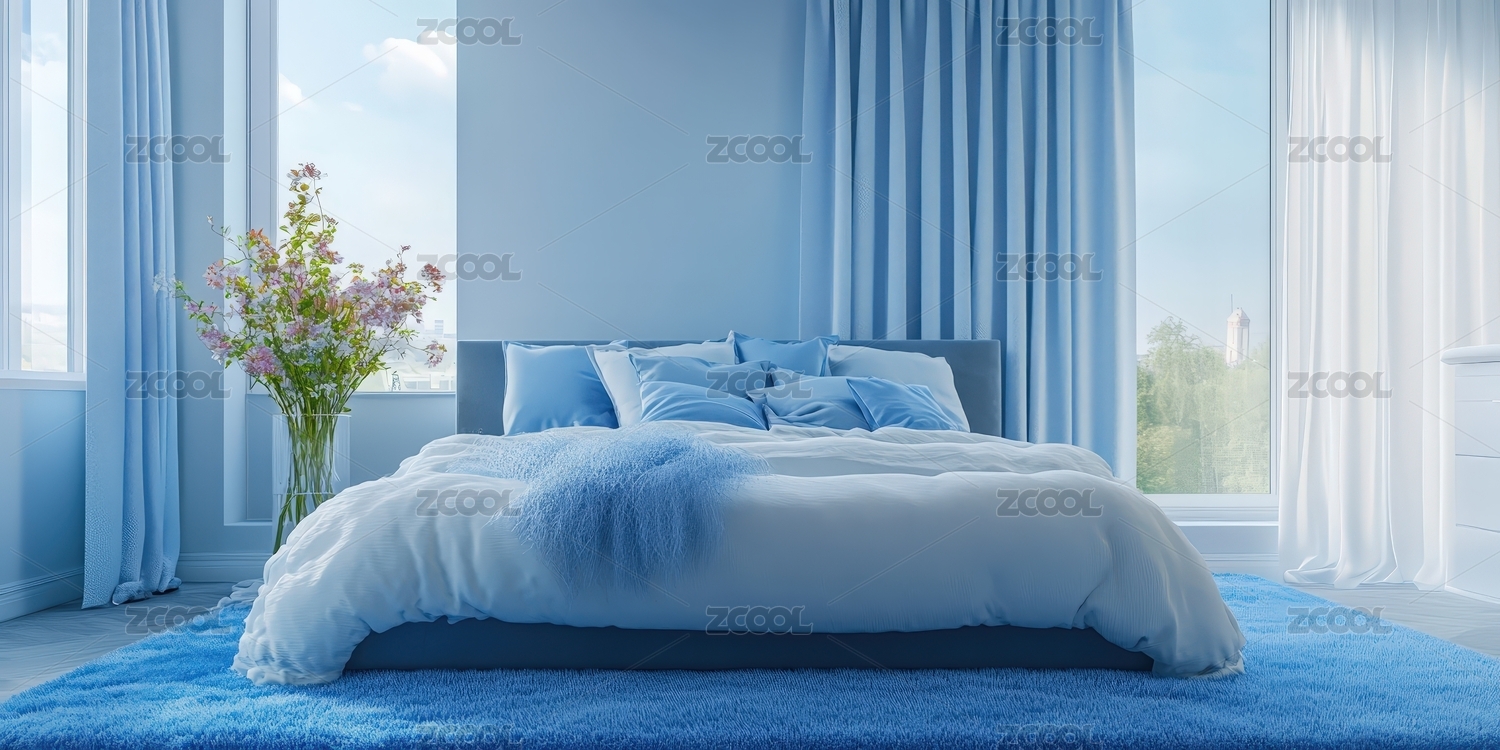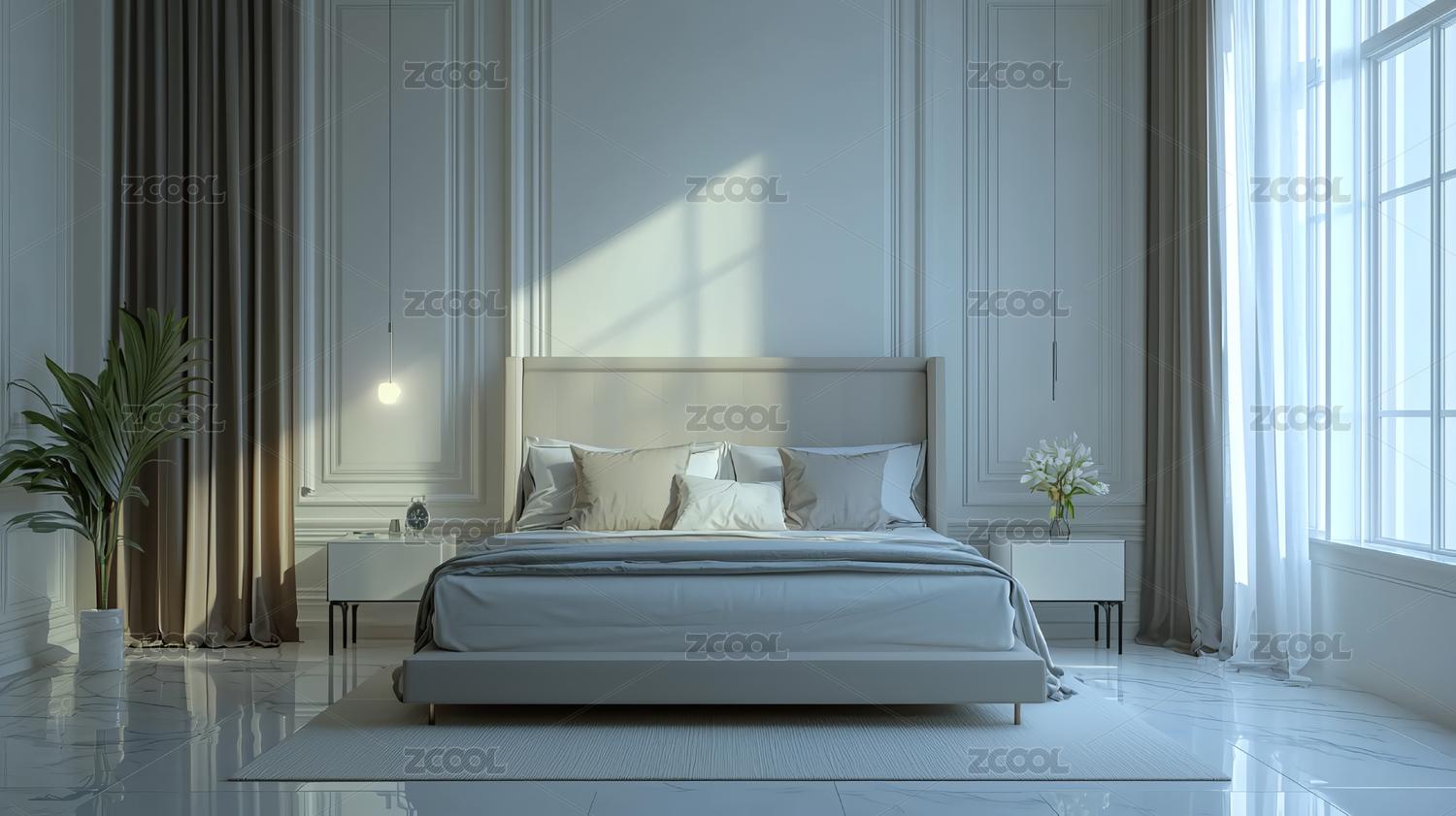 大床,扶手椅,落地窗,装饰墙,地毯,现代,卧室,灰色,床品,城市