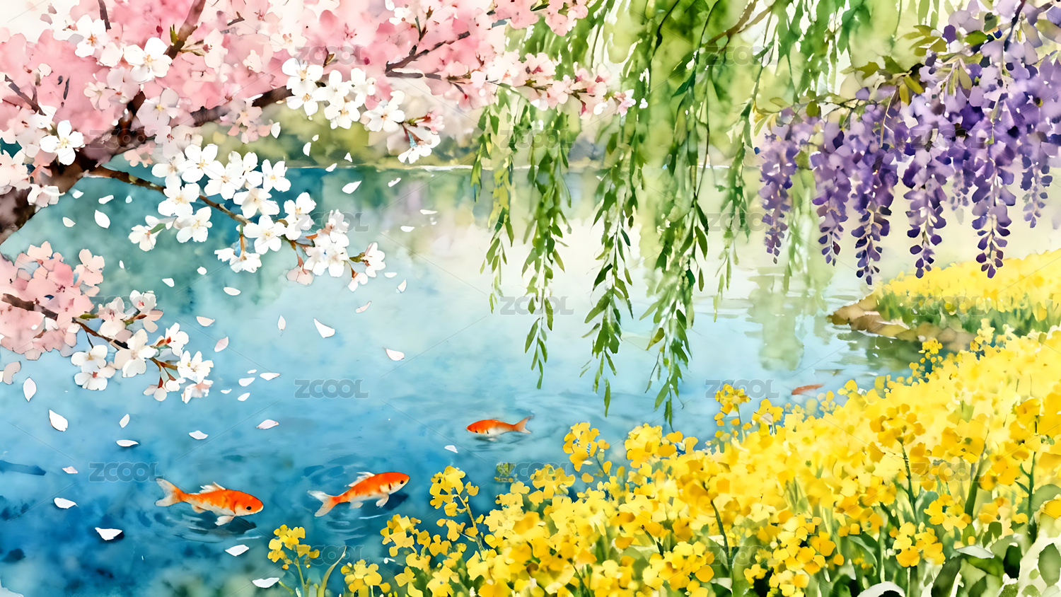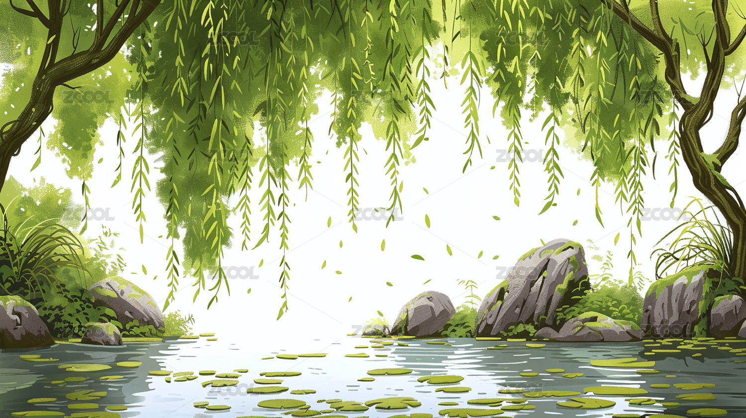 夏季池塘柳树插画