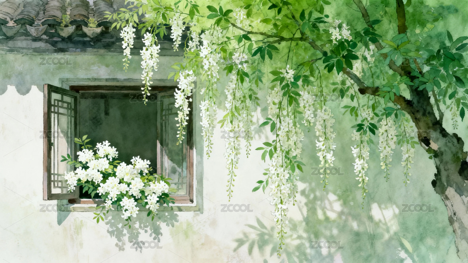 雨景,紫藤花,牡丹,蝴蝶,庭院,中式,建筑,水墨画,风格,紫色