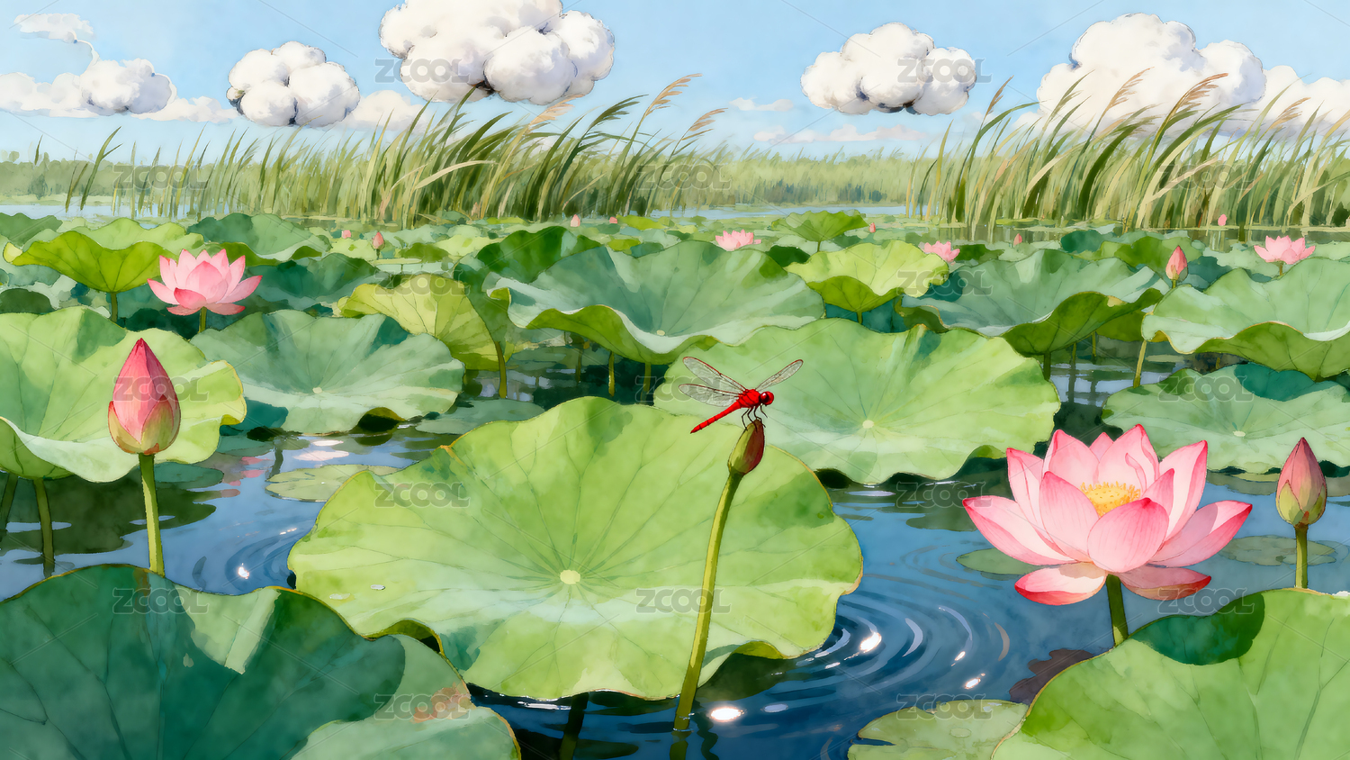 荷花,荷塘,蜻蜓,荷叶,柳树,夏日,池塘,水面,倒影,粉色