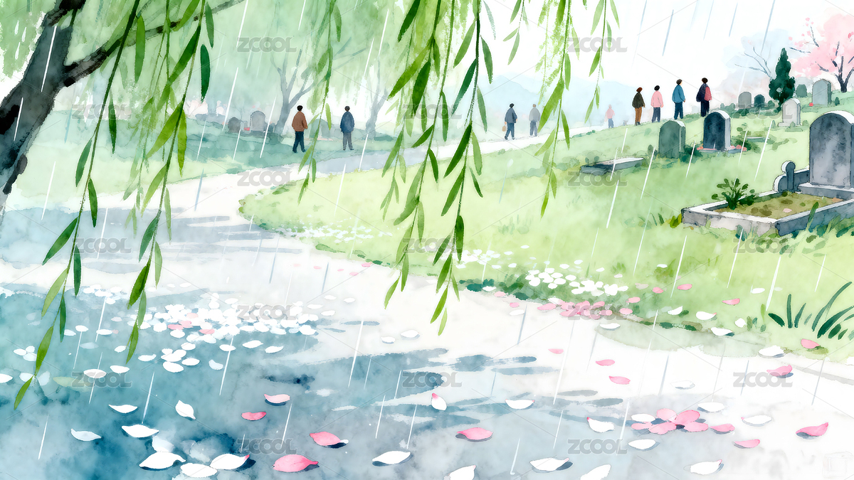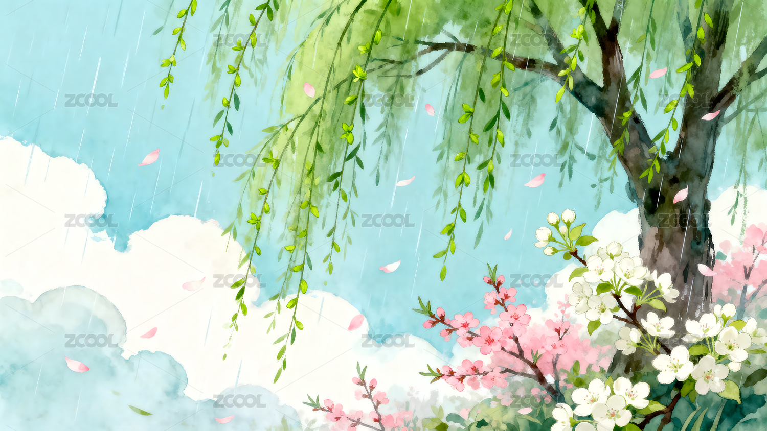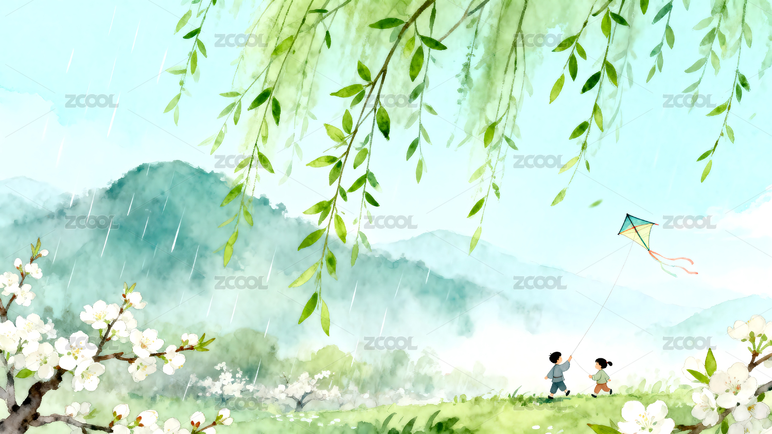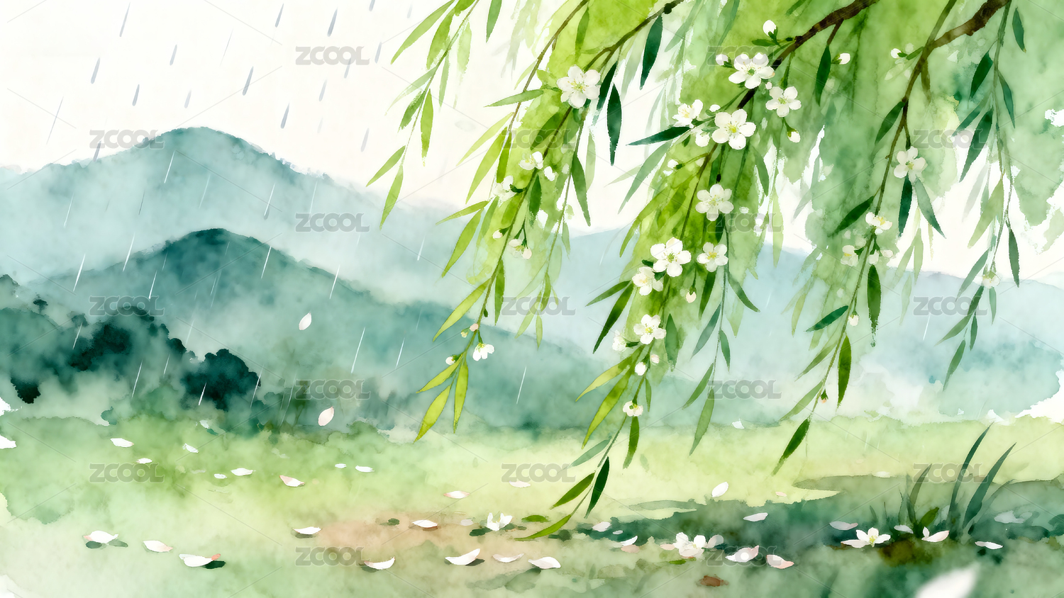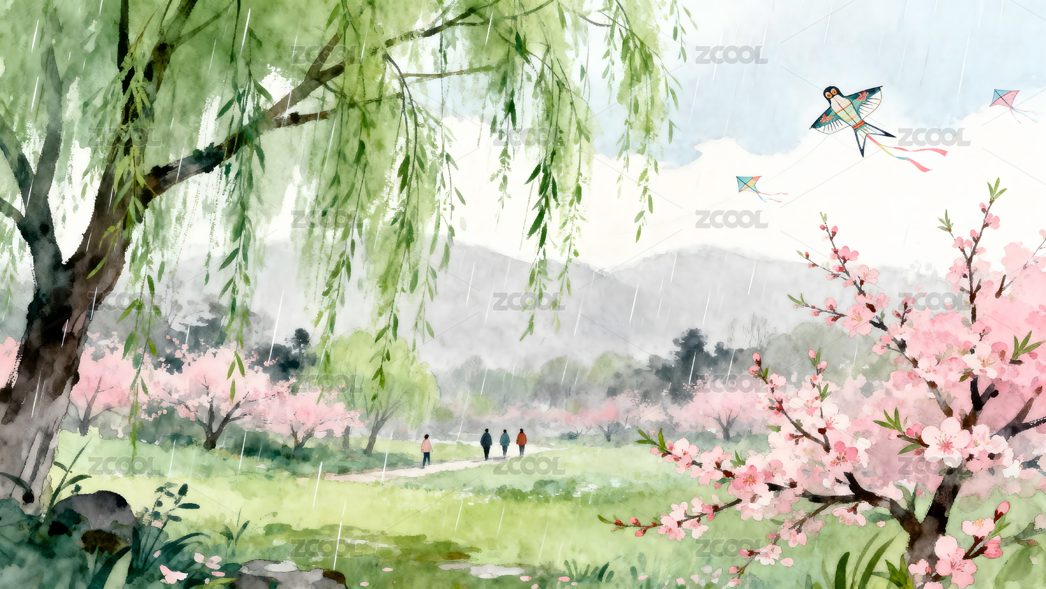 春雨,垂柳,水墨画,山水,雨滴,柳树,草地,远山,意境,清新