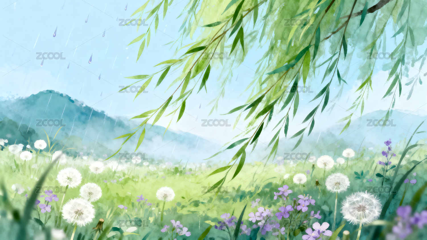 桃花,柳树,春雨,水墨画,春日,雨景,粉色,花朵,绿柳,雨滴