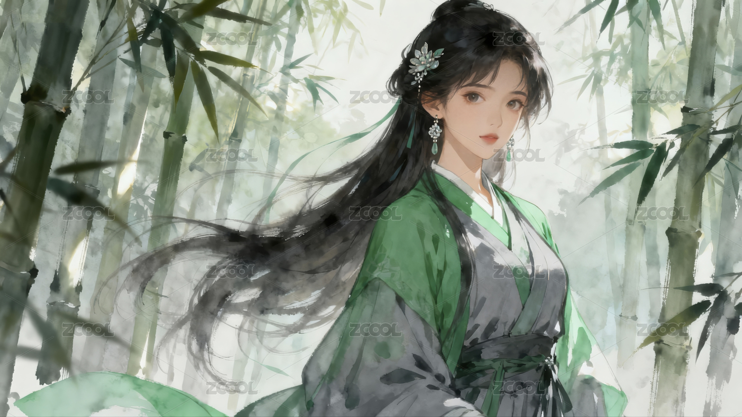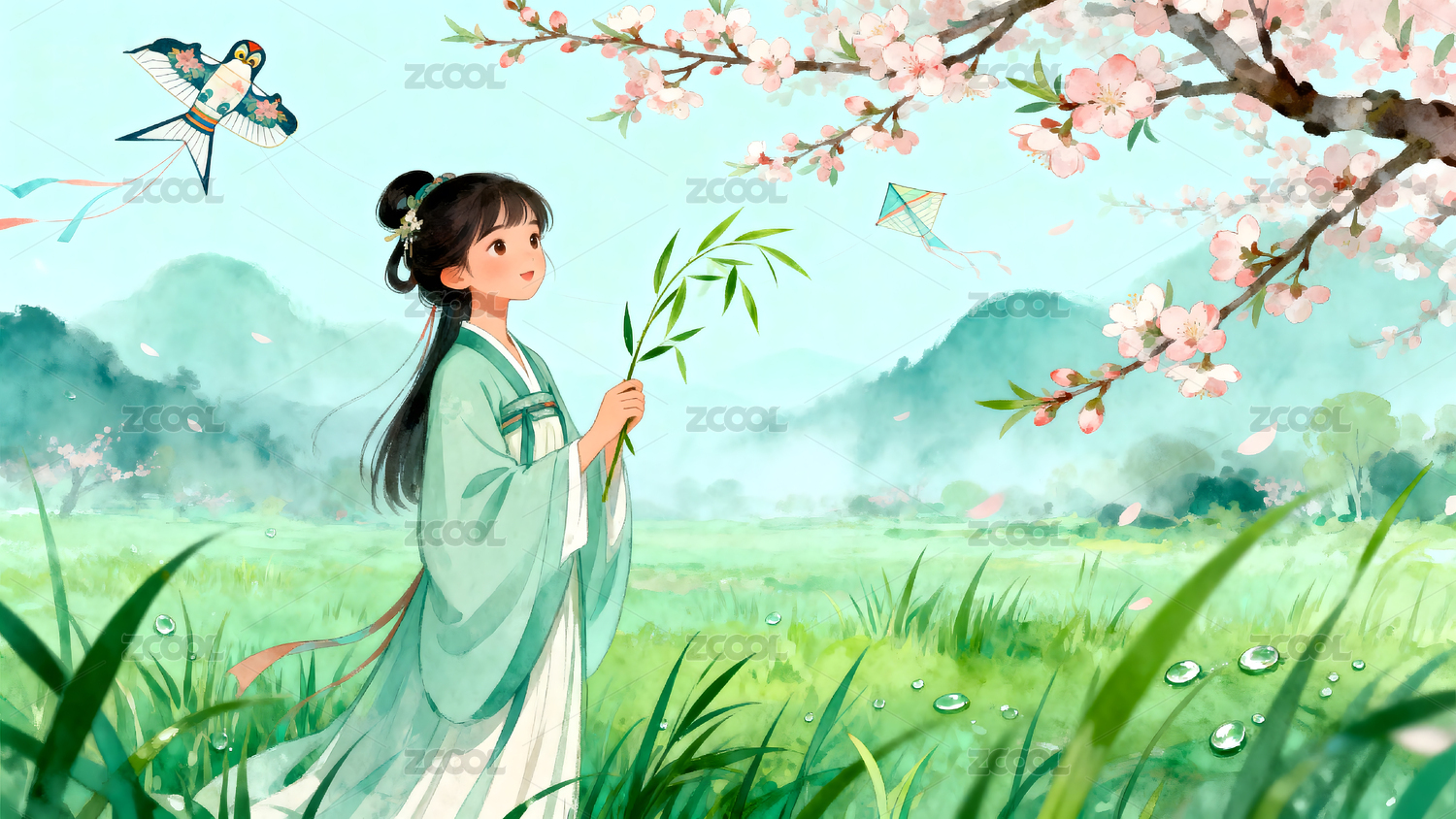 汉服,少女,春天,踏青,风筝,桃花,古风,竹林,意境,插画
