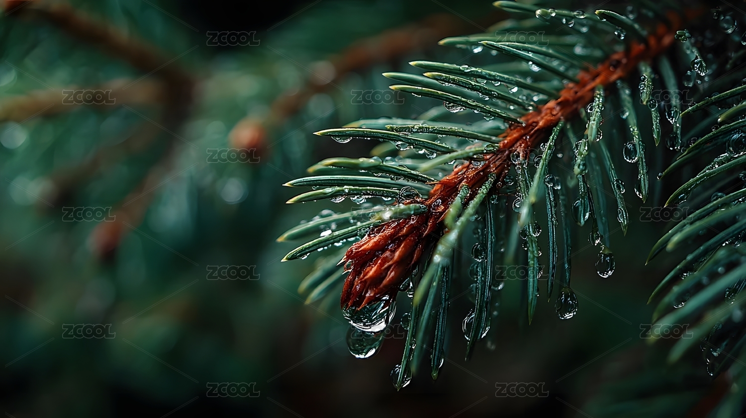 青翠的柏树叶在风中摇曳,雨滴落在叶面上